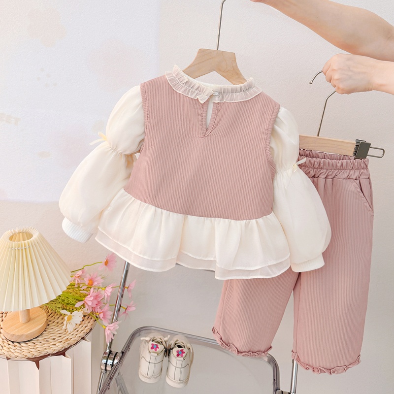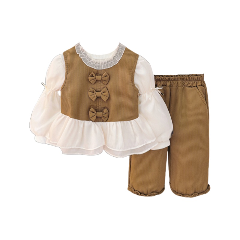 女宝森系文艺气质花边马甲长裤 女童春秋款 韩版 2025新款 三件套 套装
