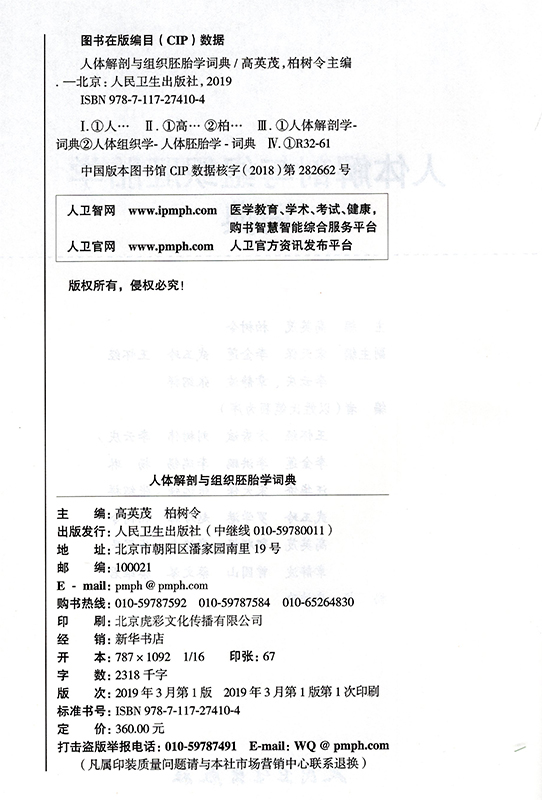 现货 人民卫生出版 人体解剖与组织胚胎学词典 柏树令 社 高英茂 正版