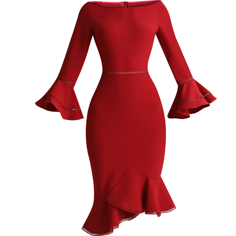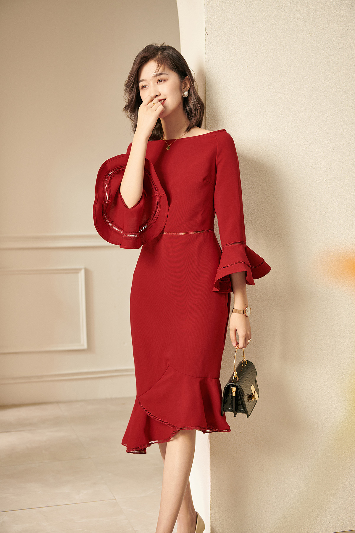 V领妈妈晚礼服 高端气质时尚 菲梦伊原创钉珠红色连衣裙女长袖 秋装