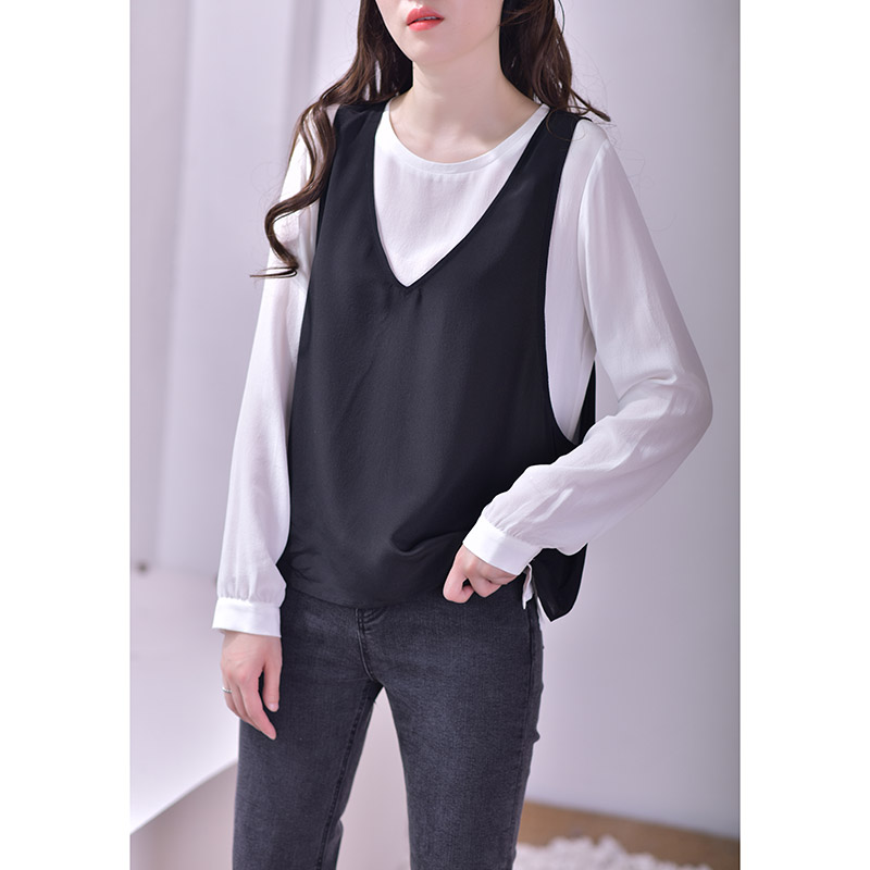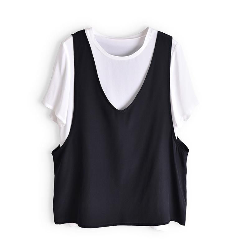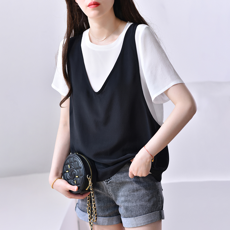 新款 夏季 洋气桑蚕丝上衣白色衬衣 背心两件套装 黑色真丝T恤女短袖