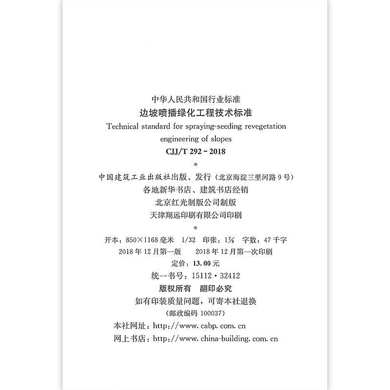 2018 T292 喷播绿化设计喷播绿化施工工程质量验收 2019年4月1日实施 社 正版 中国建筑工业出版 边坡喷播绿化工程技术标准CJJ
