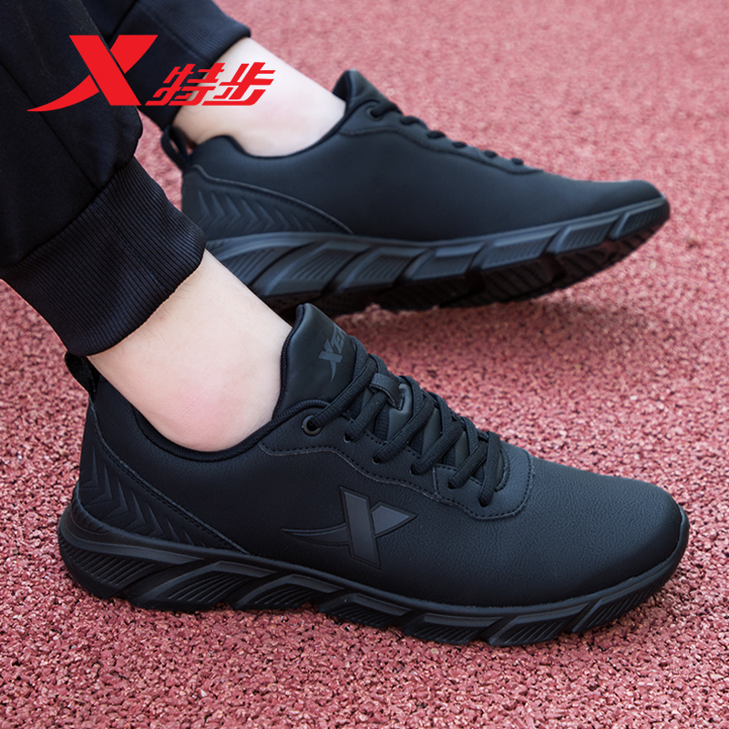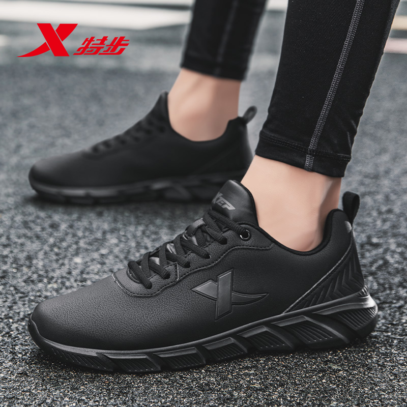子全黑跑步鞋 男款 旅游鞋 特步男鞋 运动鞋 黑色鞋 秋季 男 皮面防水跑鞋
