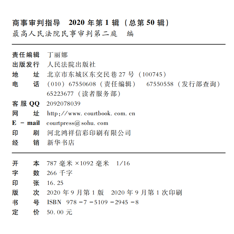 最高人民法院民事审判第二庭编 中国审判指导丛书 外商投资法 2020年第1辑 法学理论 总第50辑 法律书籍 典型案例 商事审判指导