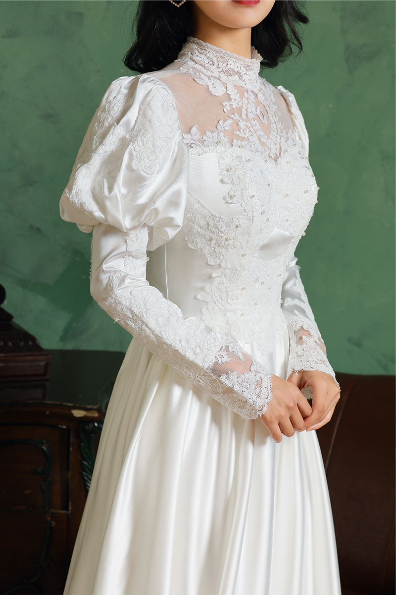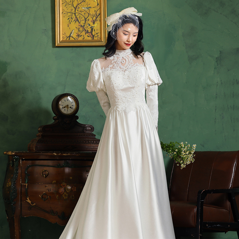 复古港风民国风缎面长袖 古董轻婚纱写真旅拍婚纱照礼服裙出门纱