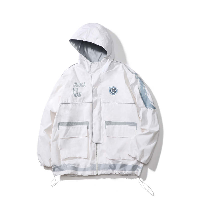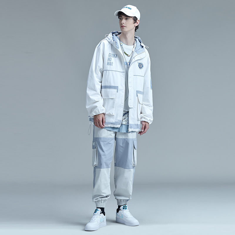 GUUKA潮牌白色连帽风衣男冬季 外套宽松 嘻哈夹克情侣运动多袋工装