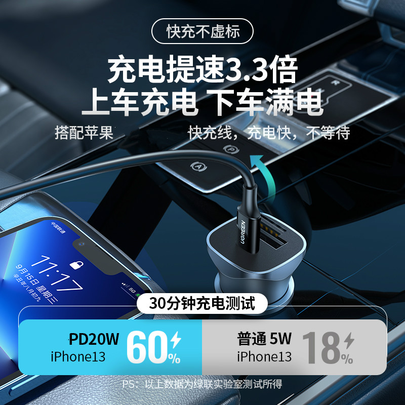 绿联pd20w车载快充电器汽车充点烟器转换头适用13pro14手机
