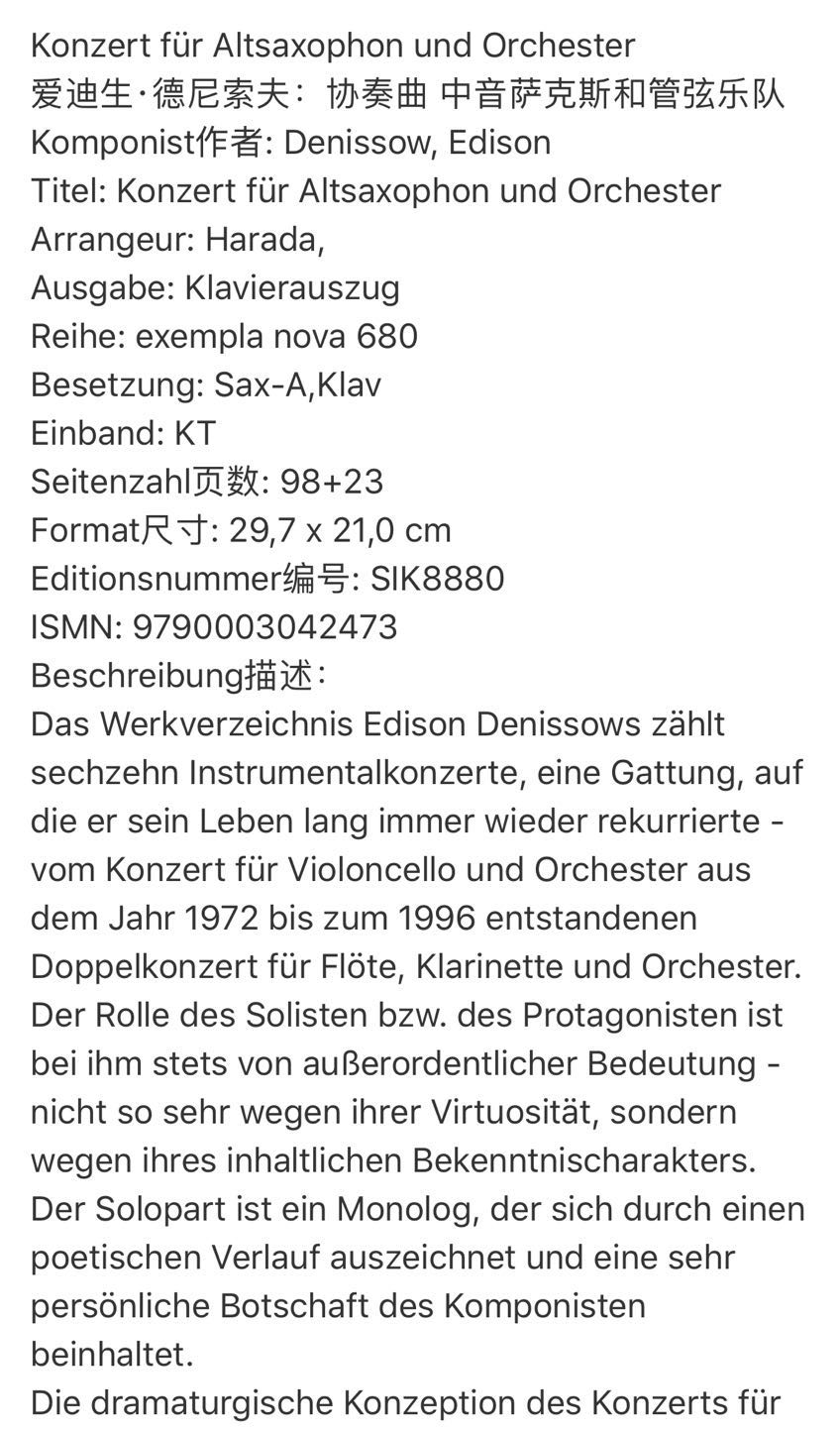 Saxophone SIK8880 思考斯基乐谱书 Concerto for Denisov 中音萨克斯和管弦乐队 Edison Orchestra 德尼索夫 Alto 协奏曲