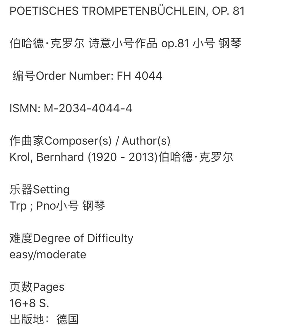 trumpet FH4044 德国霍夫曼斯特 Krol POETISCHES 进口乐谱书 小号和钢琴 原版 piano 诗意作品集Op81 TROMPETENBUCHLEIN 克洛尔