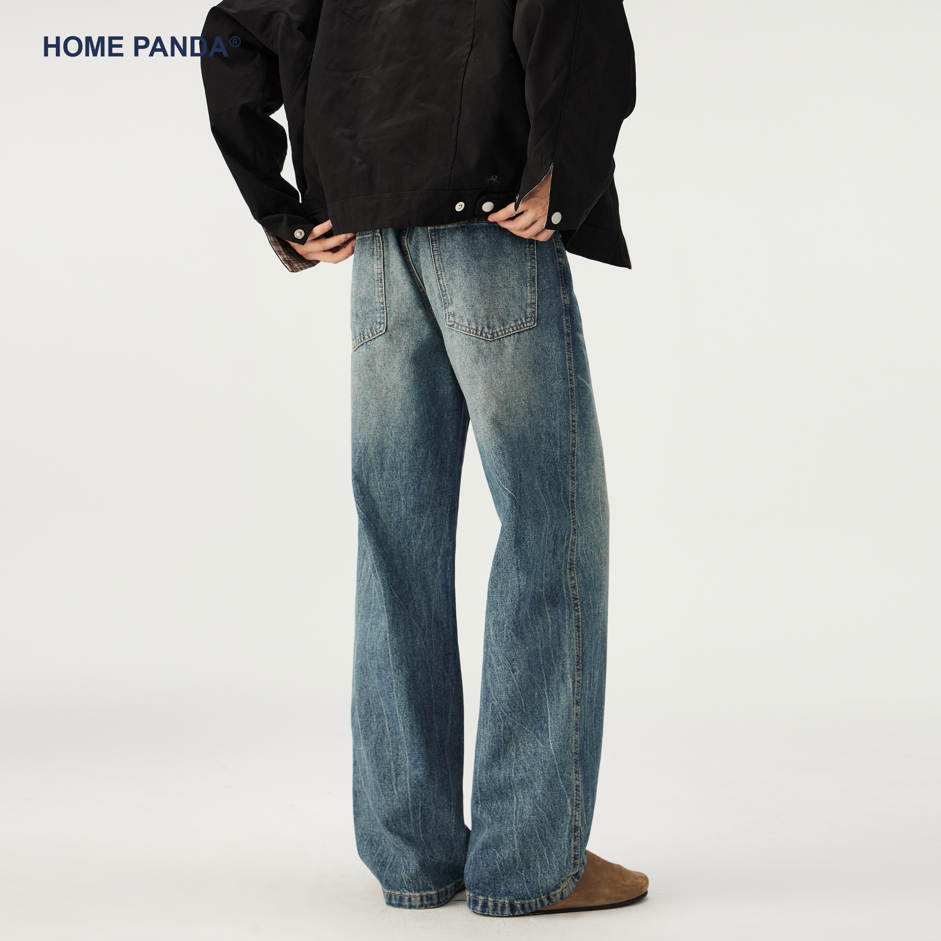 复古cleanfit宽松阔腿裤 美式 男秋季 HomePanda水洗做旧直筒牛仔裤