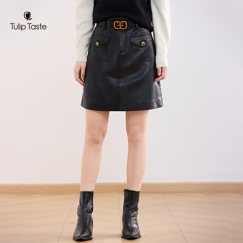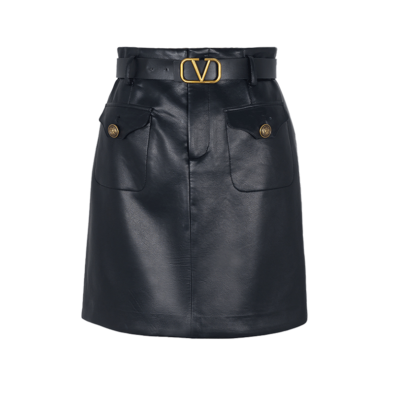太平鸟春季 肌理感PU皮裙短裙自带腰带潮酷半身裙A字裙 款