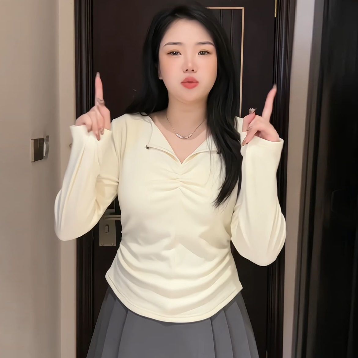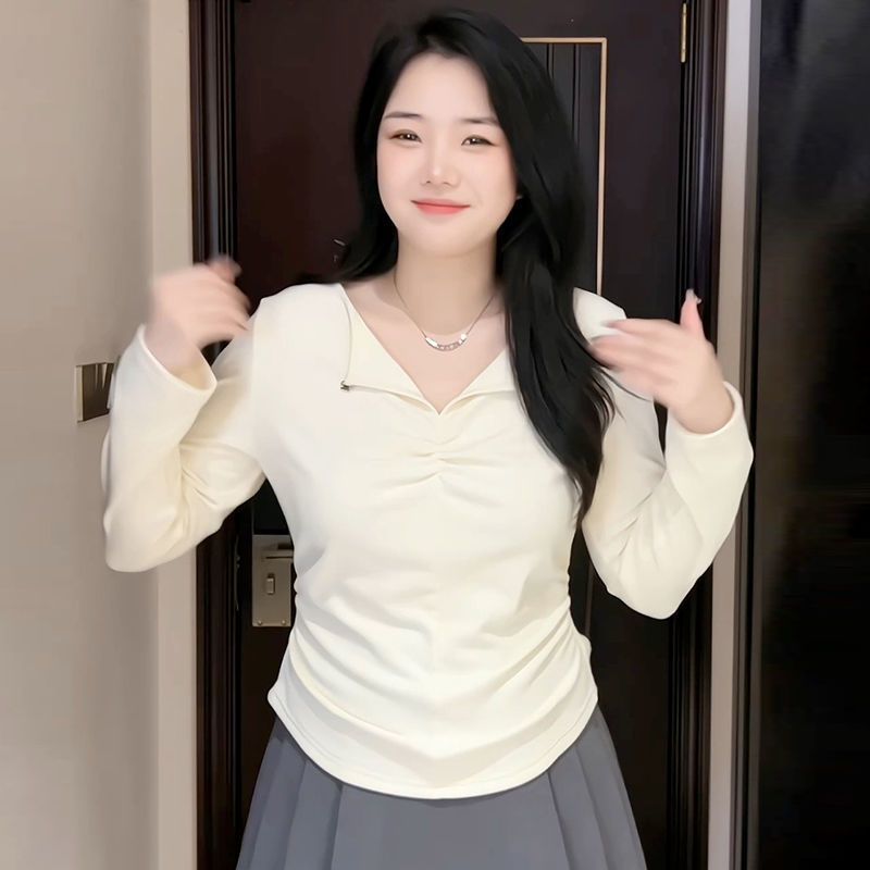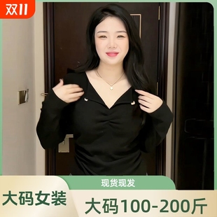 女胖mm内搭秋冬微显瘦百搭修身 打底衫 t恤上衣 设计感V领长袖 大码