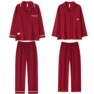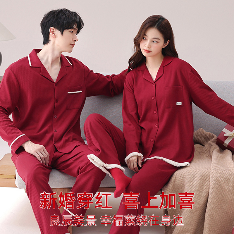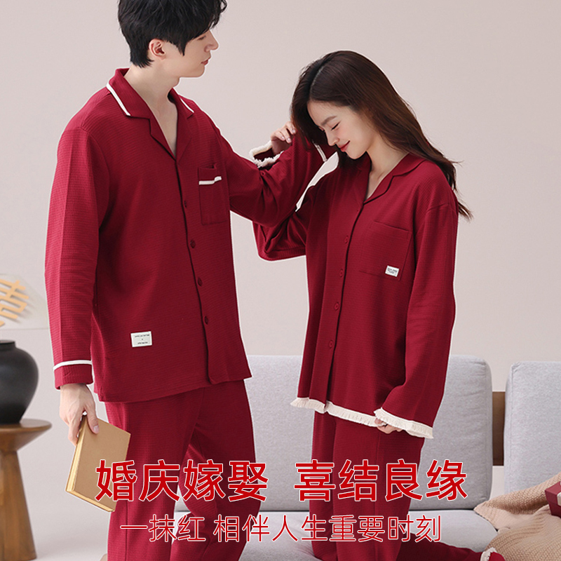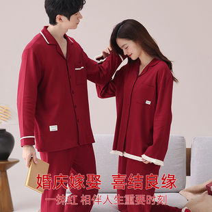 睡衣结婚新婚情侣套装 女春秋纯棉红色家居服男本命年中国风新中式