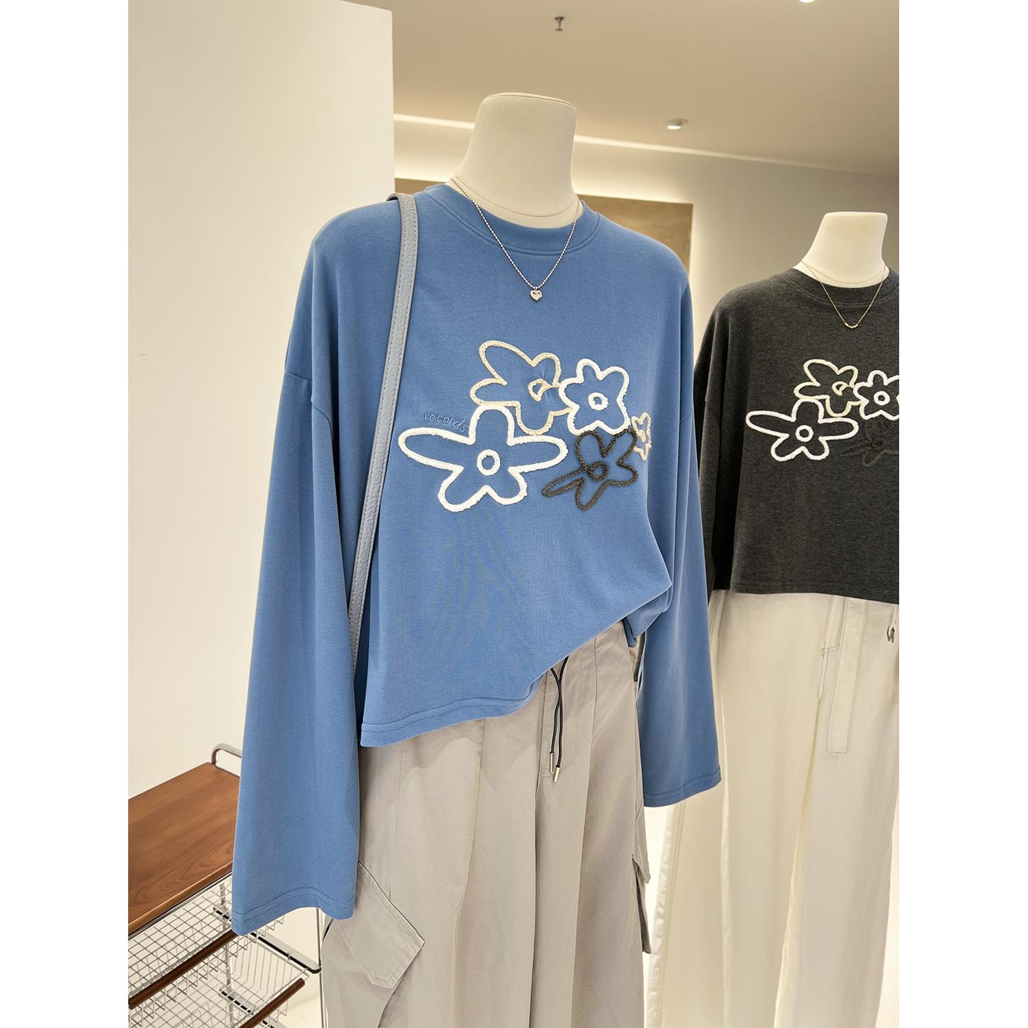百搭圆领打底衫 T恤女秋款 上衣 复古宽松显瘦长袖 纯棉刺绣小花美式
