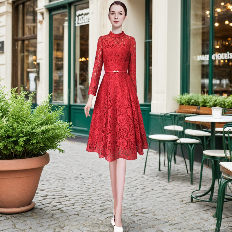 黛薇璐媤立领蕾丝公主连衣裙女2025秋新款 气质收腰礼服A裙红 法式