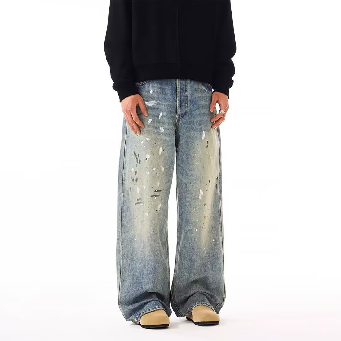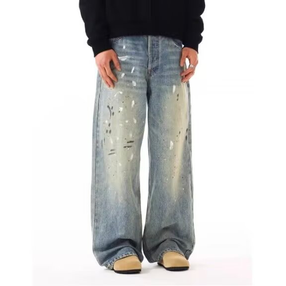 丹宁原色阔腿A字长裤 男秋冬季 子 宽松直筒加绒牛仔裤 HomePanda美式