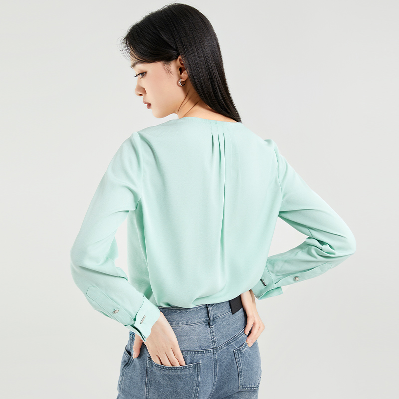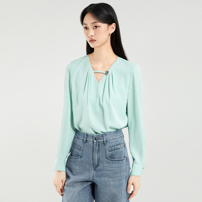 女修身 2025秋季 雪纺衫 长袖 显瘦百搭网纱蕾丝小立领打底上衣潮 时尚