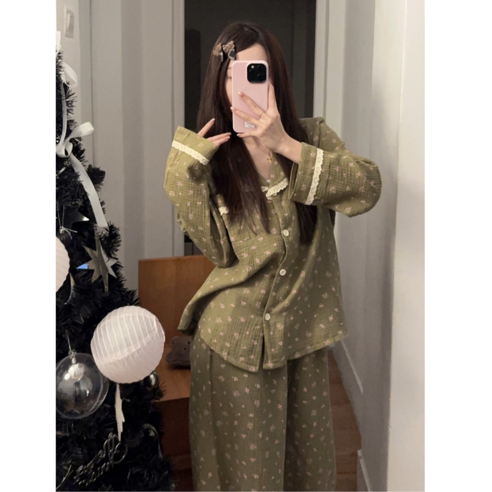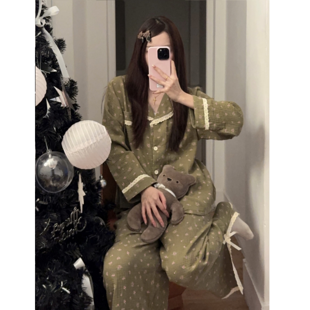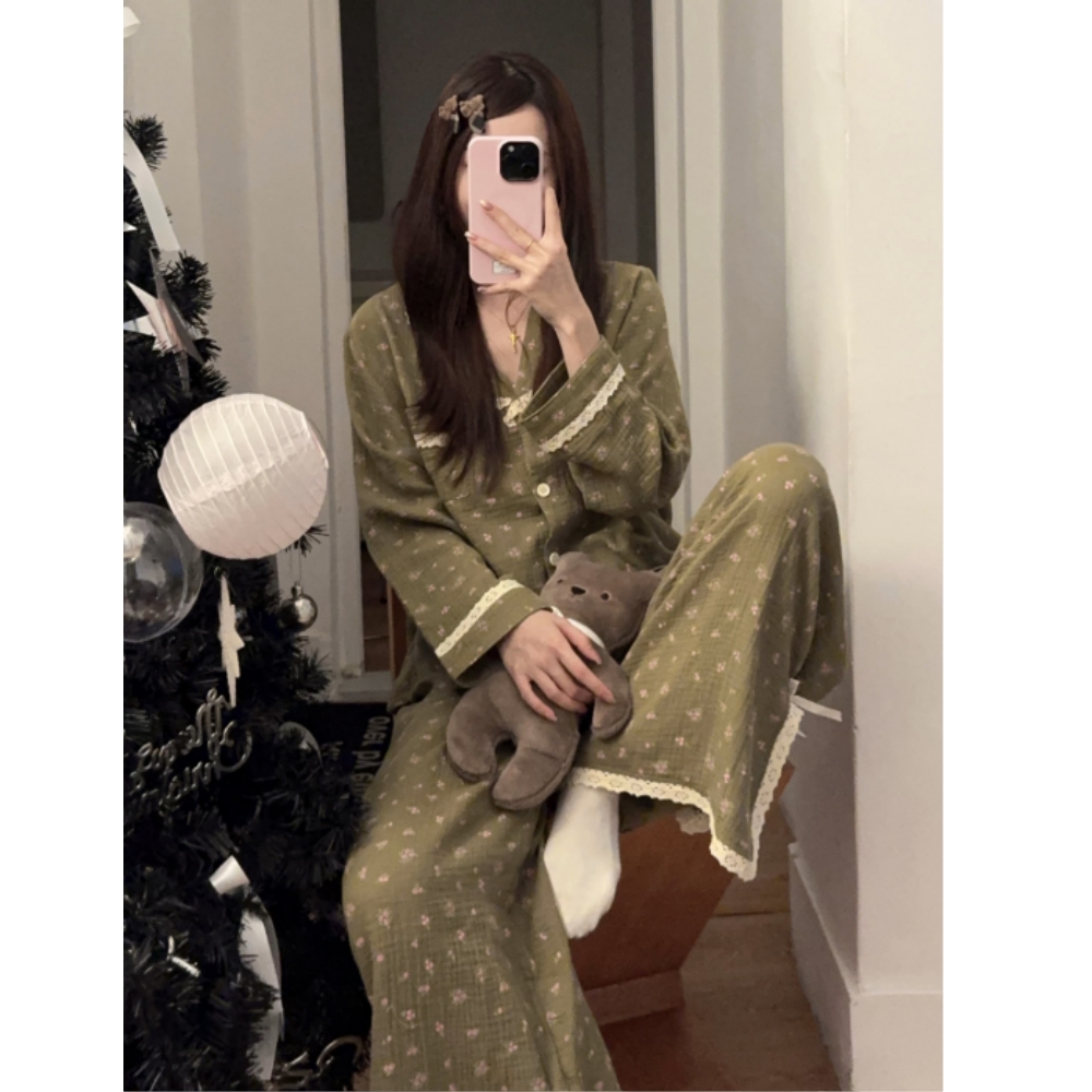 长袖 纯棉100%棉家居服套装 长裤 开衫 网红个性 婴儿棉纱睡衣女春秋季