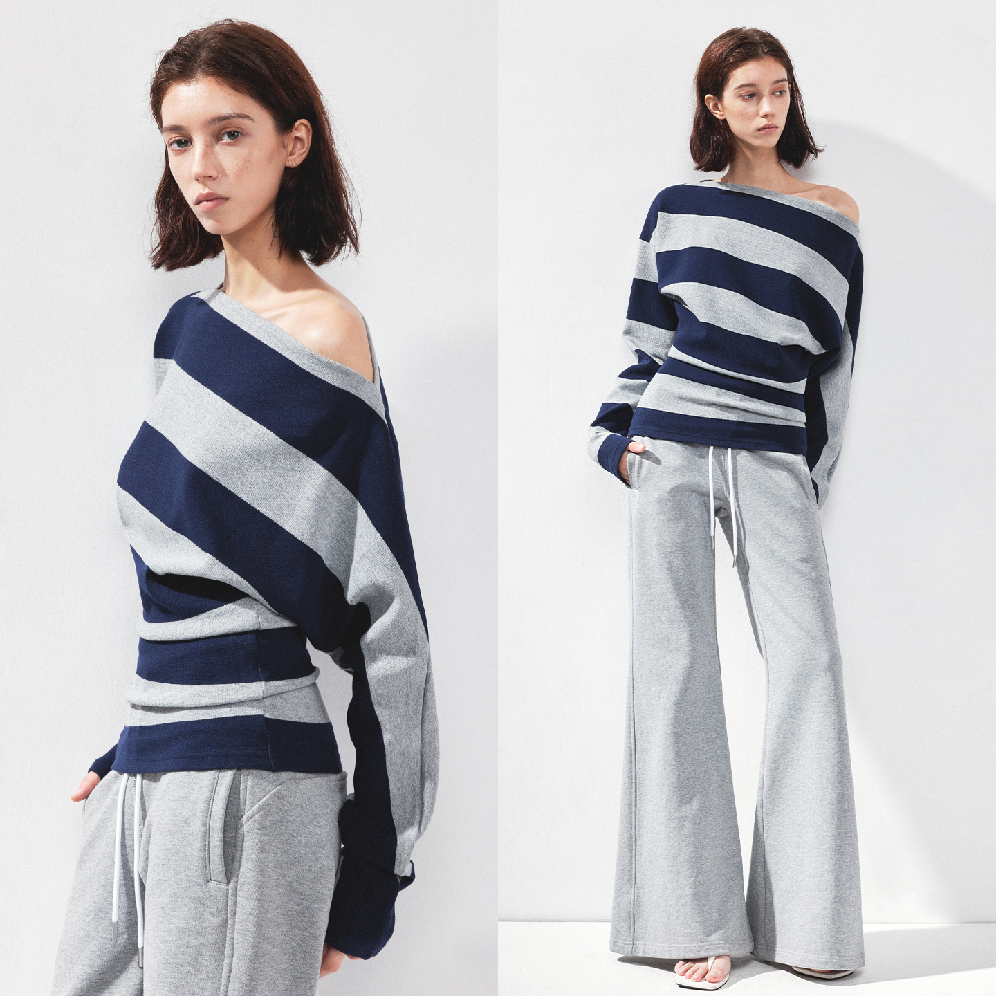 露肩休闲复古显瘦高级感上衣 t恤 KVKV 藏蓝白宽条纹斜肩收腰长袖