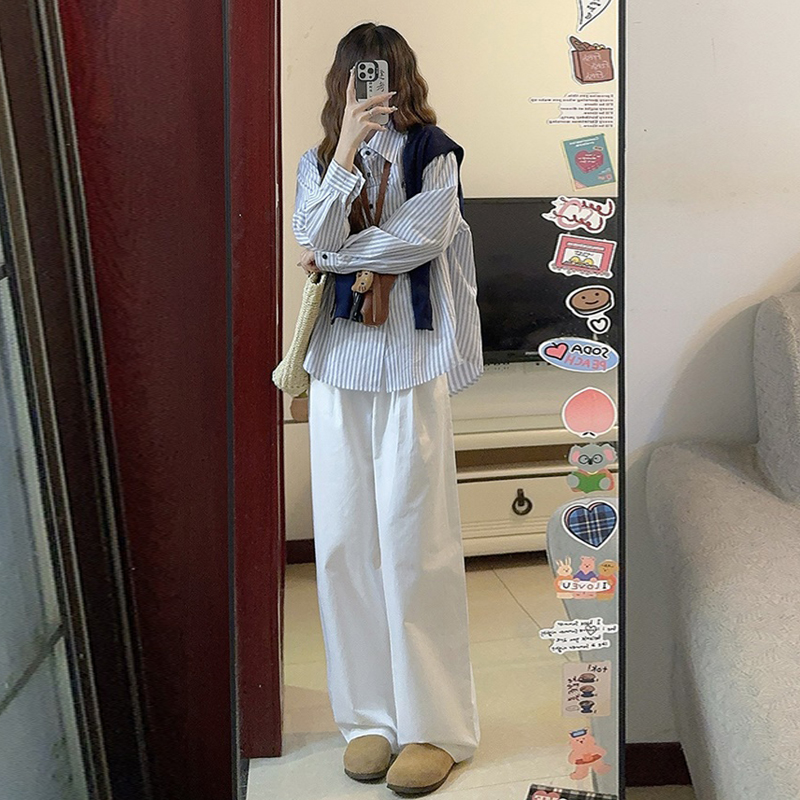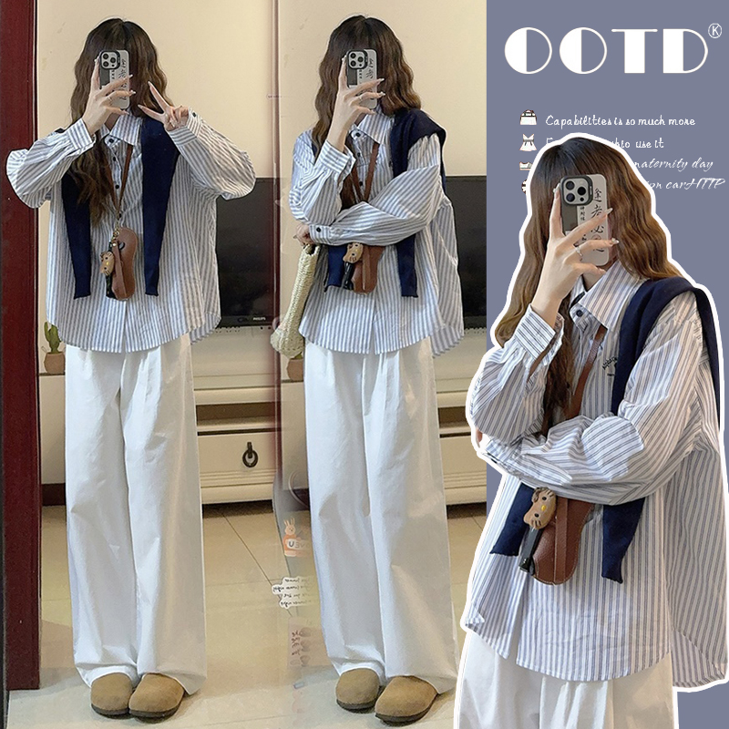 韩版 春秋套装 条纹衬衫 阔腿裤 小个子穿搭 孕妇装 两件套秋季 2025新款