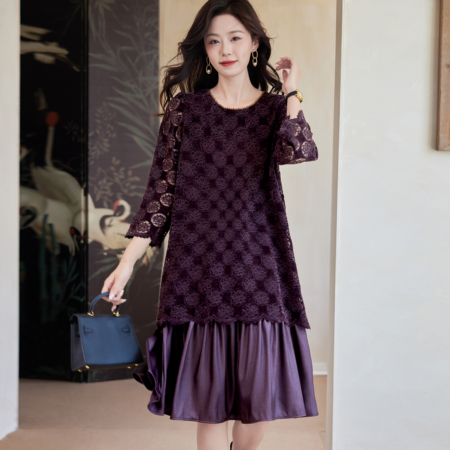 宝诗黎圆领钉珠蕾丝长袖 气质宽松优雅减龄A字裙女 连衣裙2025秋季