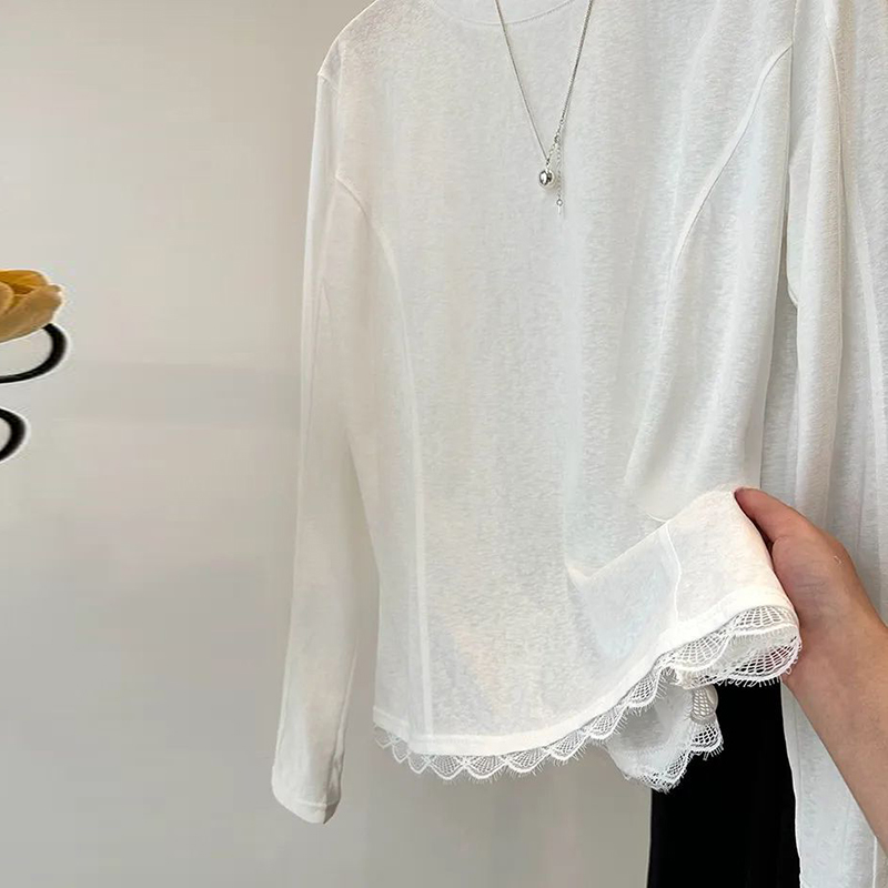 白色雪花棉长袖 蕾丝花边拼接下摆上衣 T恤女早秋宽松内搭打底衫