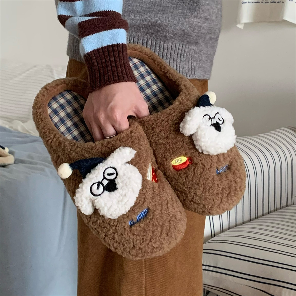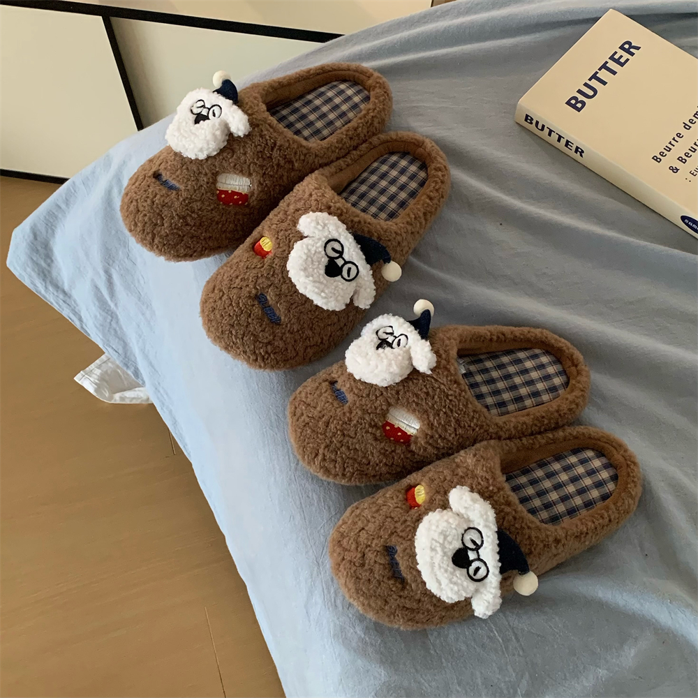 居家月子棉拖鞋 保暖情侣可爱ins小狗毛毛拖鞋 男女冬地板鞋 细细条