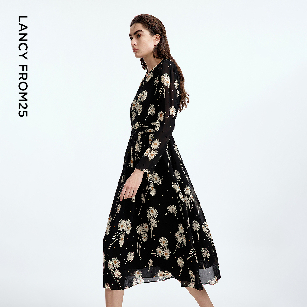 朗姿黑色v领碎花裙复古风a字收腰高级感气质印花裙2025年秋季 新款