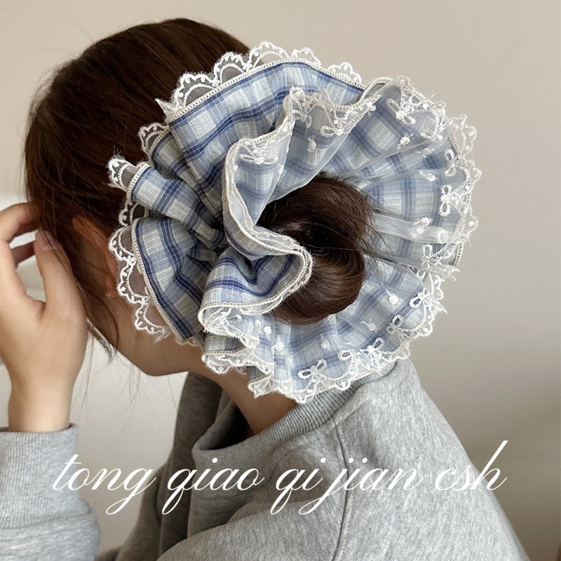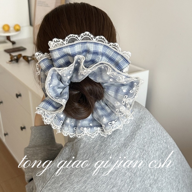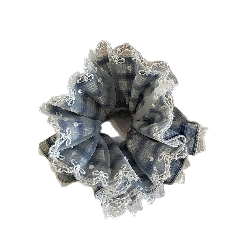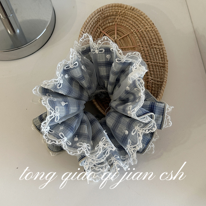 2025年新款 双层立体蓝色格纹发圈文艺少女风蕾丝花边大肠圈发饰女
