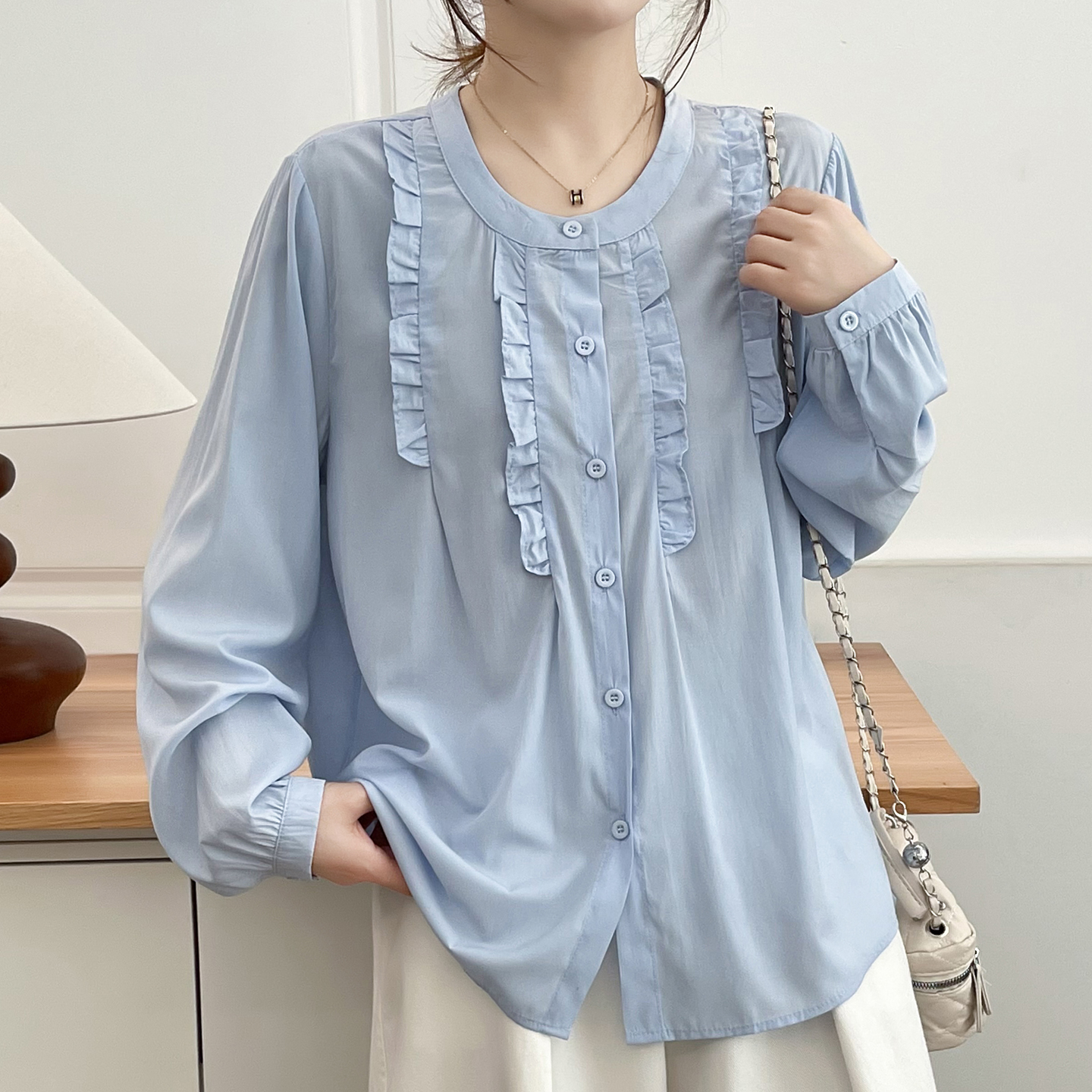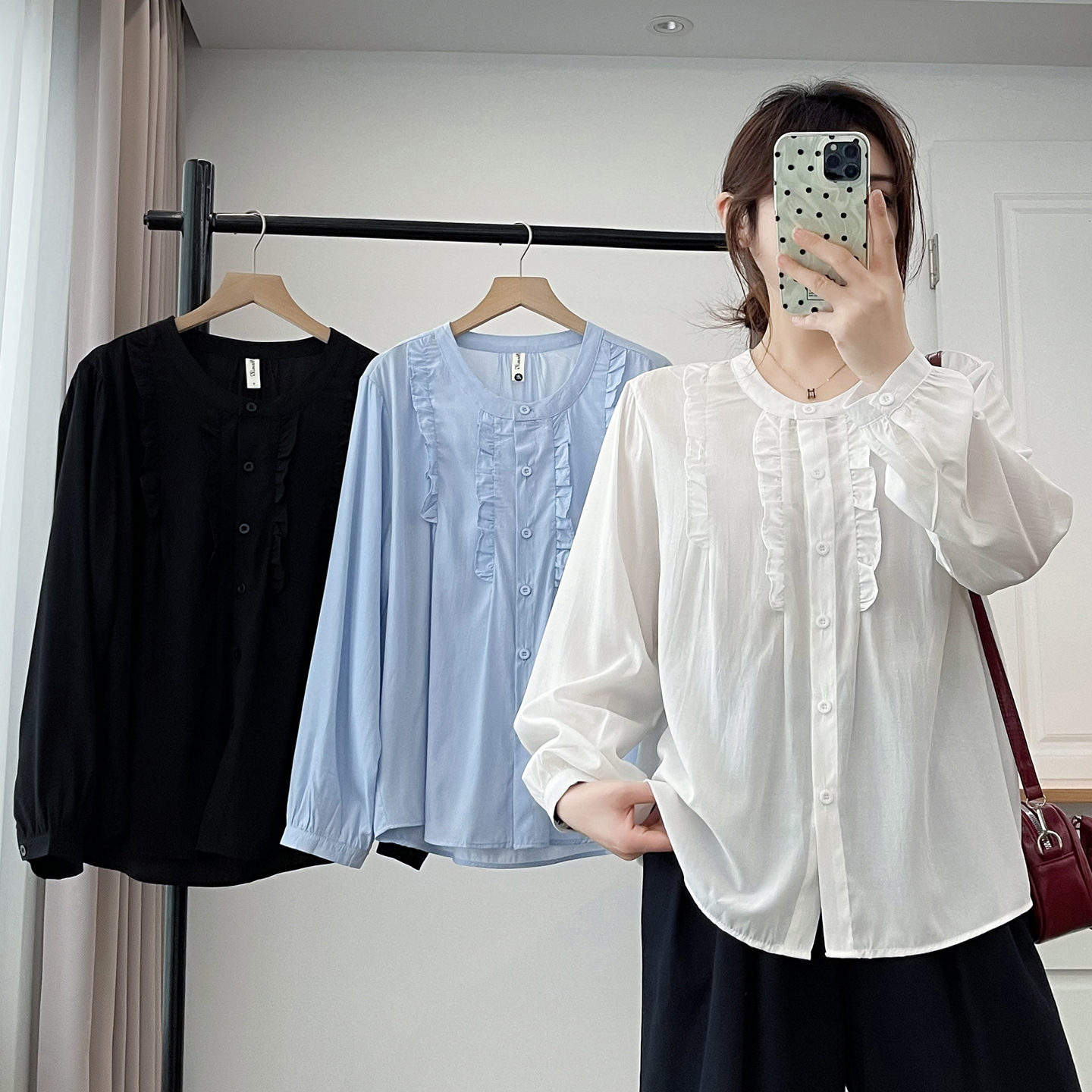 早秋洋气荷叶边漂亮长袖 胖mm通勤简约休闲上衣气质正肩薄衬衣 衬衫