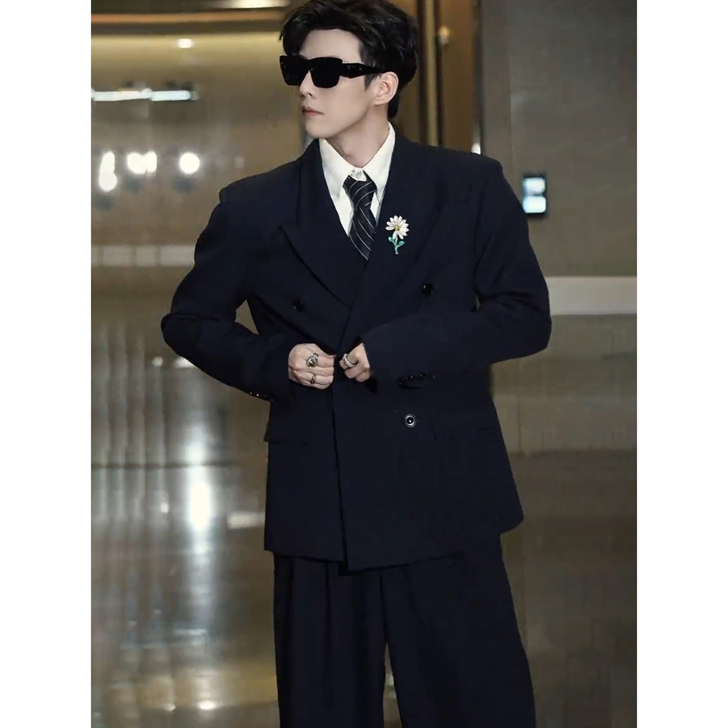 休闲西服高级感垂感微喇西裤 黑色戗驳领垫肩西服套装 英伦雅痞男士