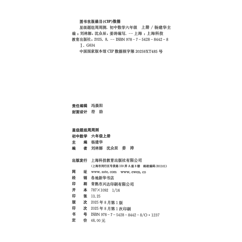 星级题组周周测初中数学六年级上册 社 每周一练掌握重难点知识清单梳理重点脉络双组训练攻克薄弱环节6上第一学期上海科技教育出版