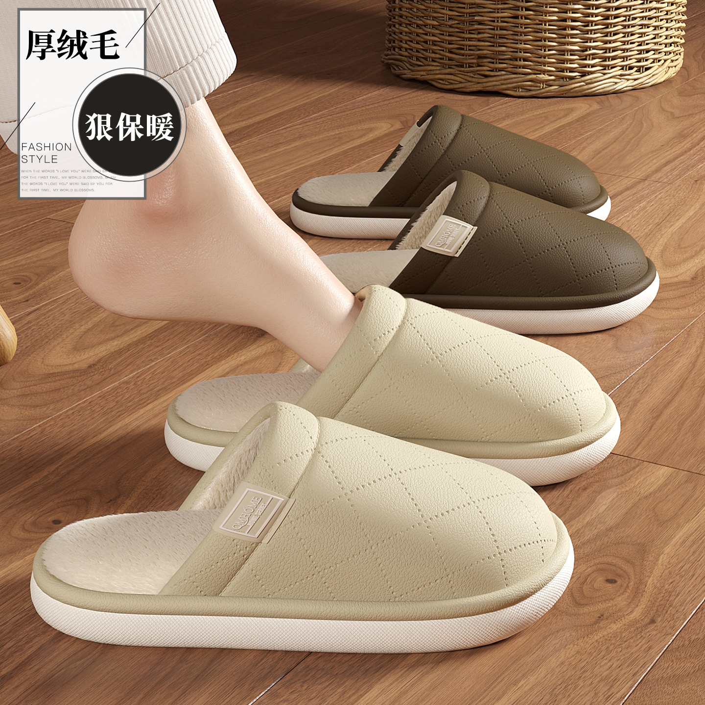 室内家居毛绒保暖舒适防滑毛拖鞋 2025新款 女 女秋冬季 PU防水棉拖鞋