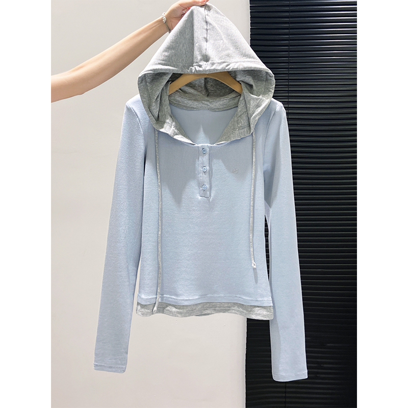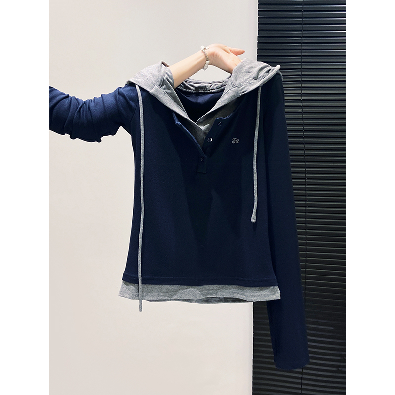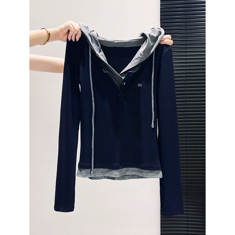 显瘦打底小衫 假两件修身 上衣 t恤女早秋外穿2025新款 拼接连帽长袖
