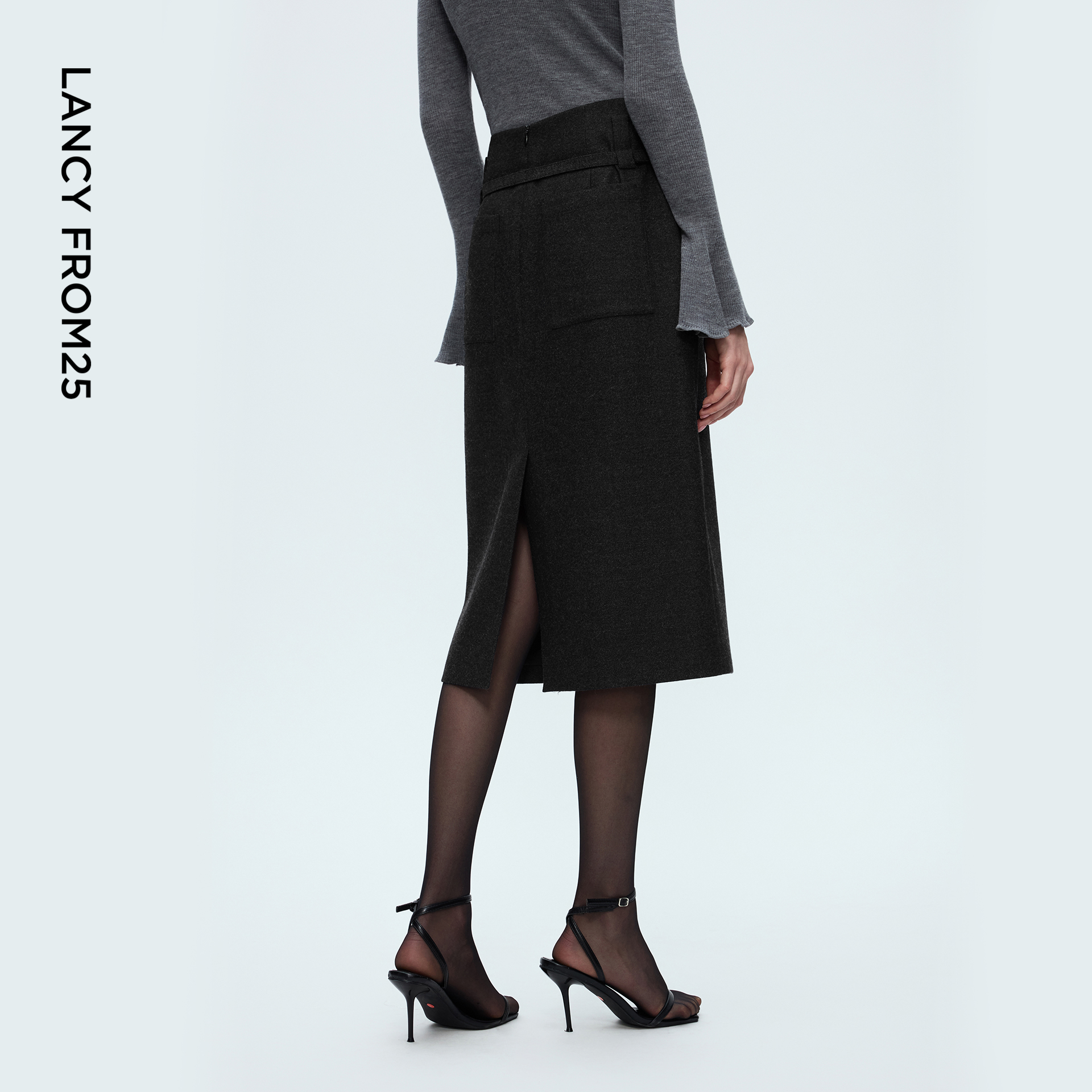 MOCO半身裙含绵羊毛精纺高腰解构斜襟高开叉附皮带摩安珂