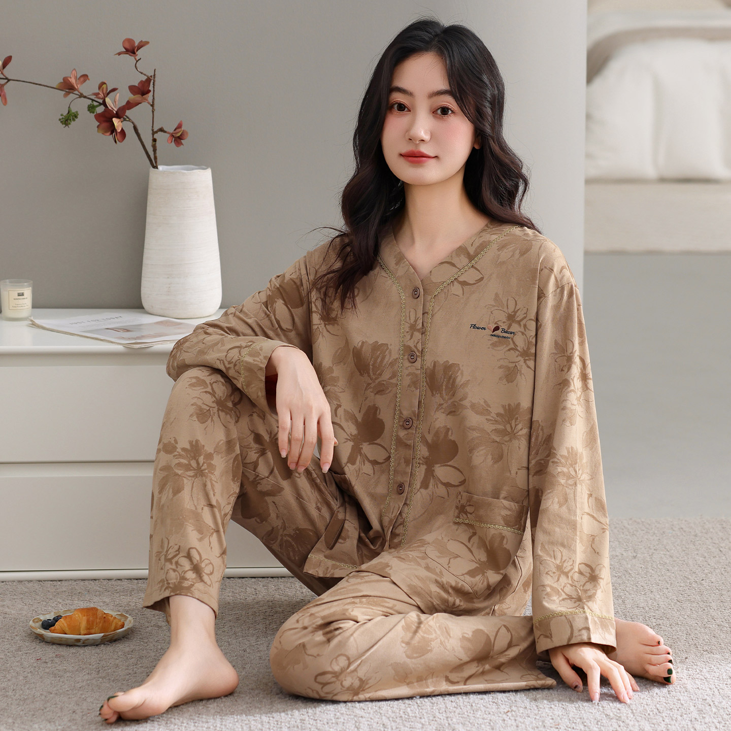 长袖 全棉大码 套装 女款 家居服 简约休闲秋季 芬腾春秋睡衣女纯棉开衫