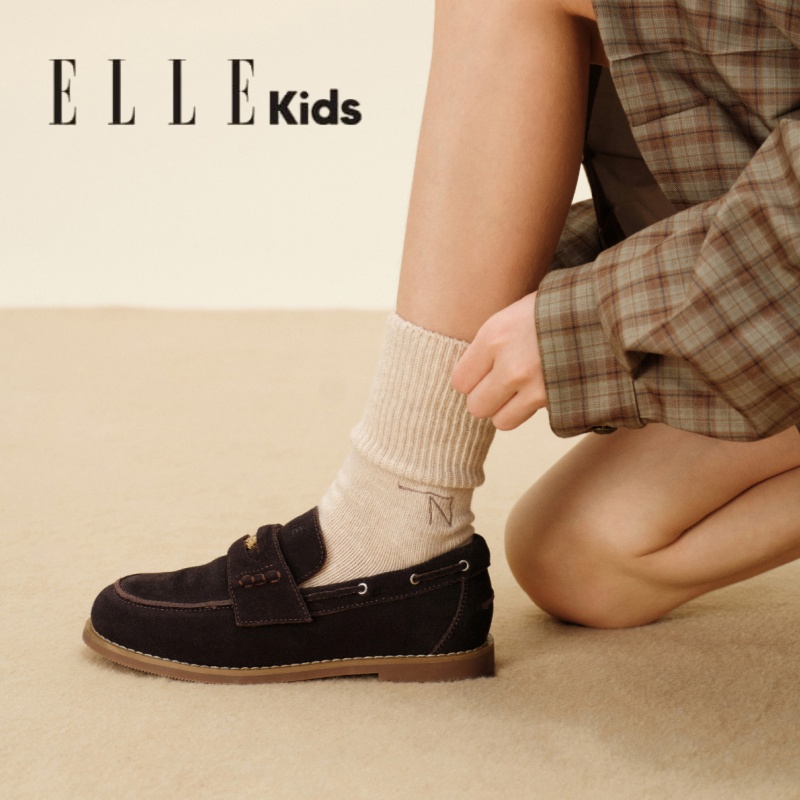 小女孩浅口皮鞋 魔术贴早秋新款 黑色复古平底乐福鞋 ELLEkids童鞋