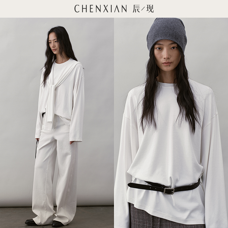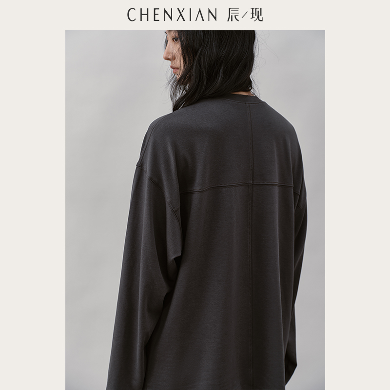 圆领显瘦上衣套装 CHENXIAN辰现松弛感别致宽松连帽披肩长袖 T恤衫