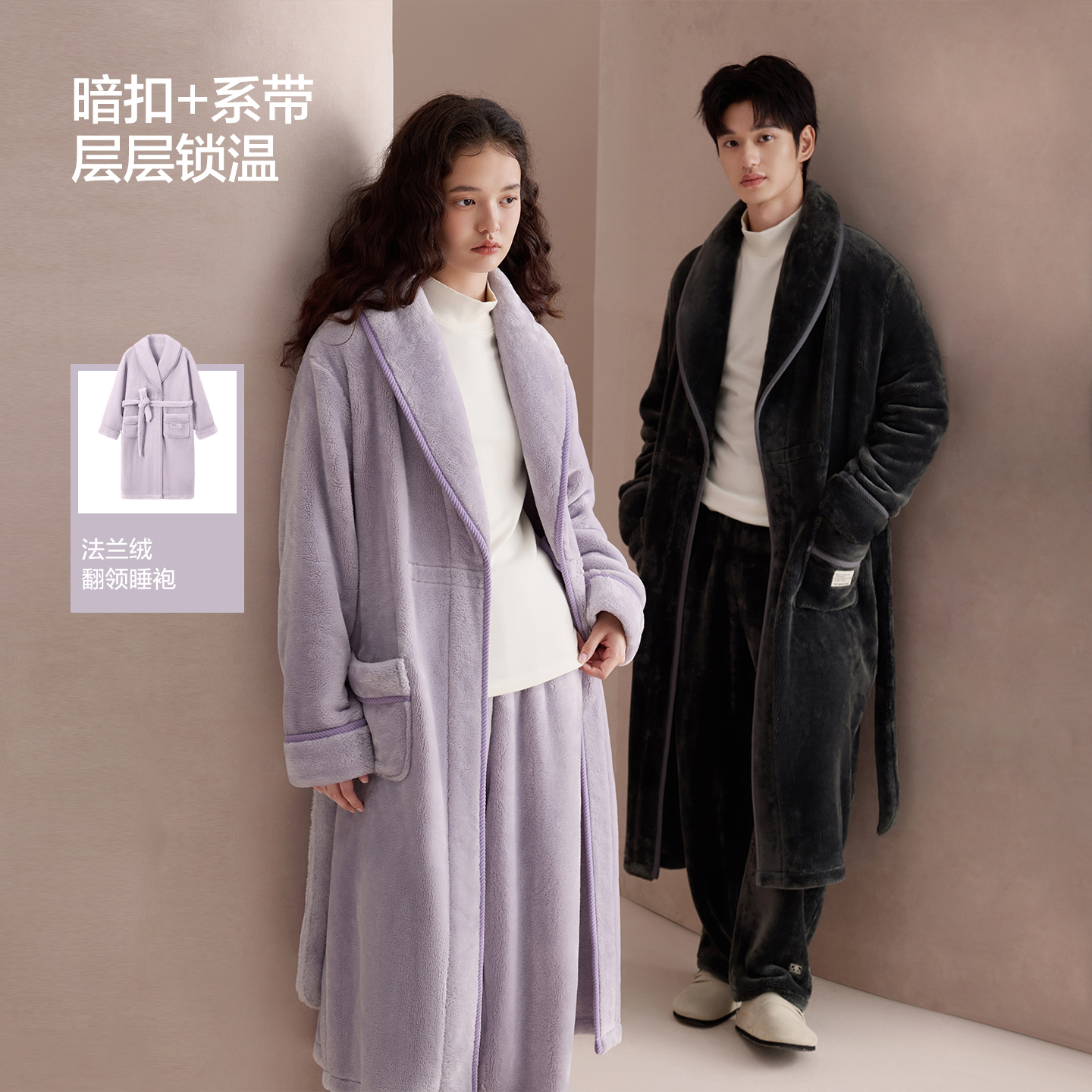 红豆情侣睡袍法兰绒男女士抗静电浴袍长款 加厚保暖睡衣家居服 冬季