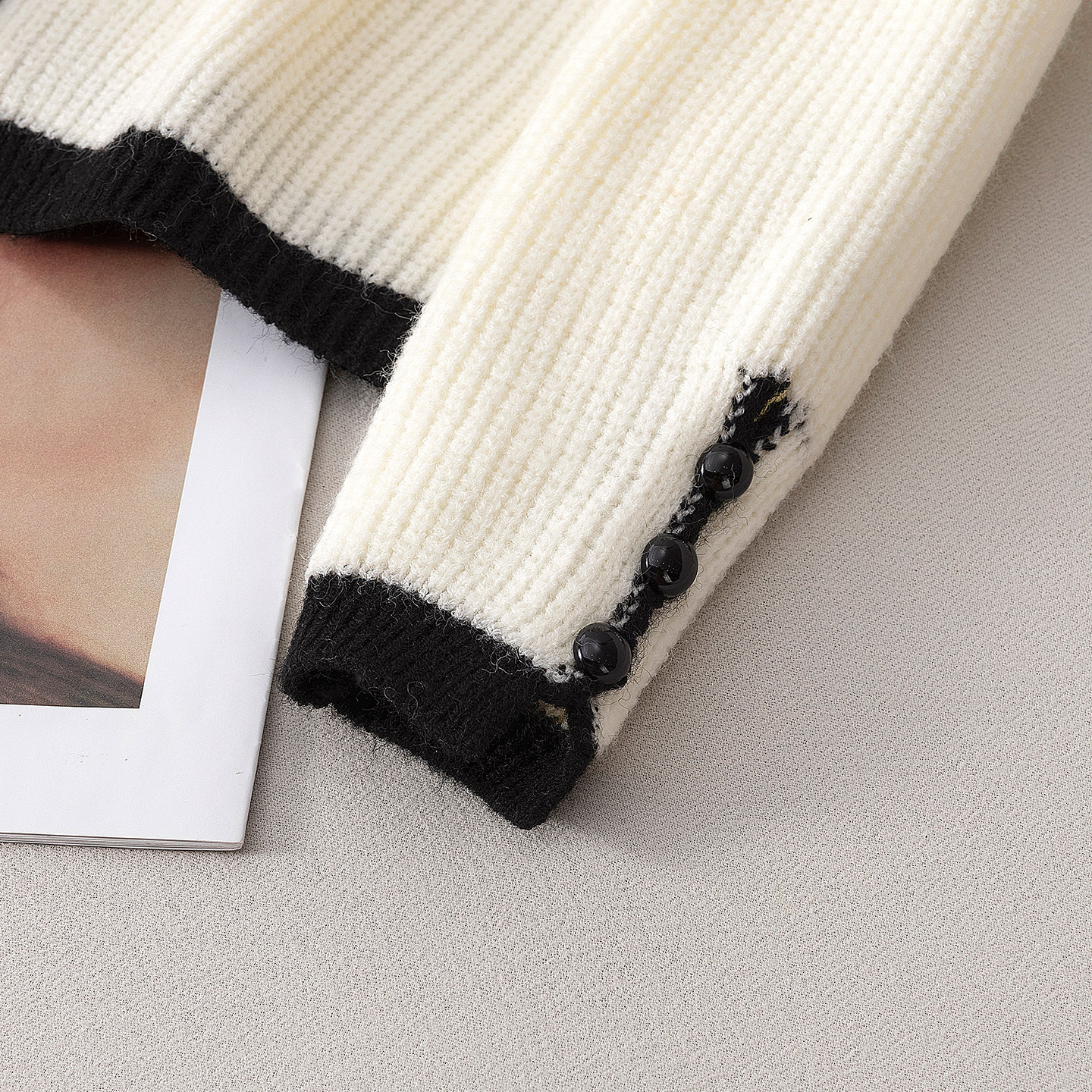 女装 新款 时尚 撞色单排扣宽松款 上衣 她池翻领针织衫 短款 2025秋装