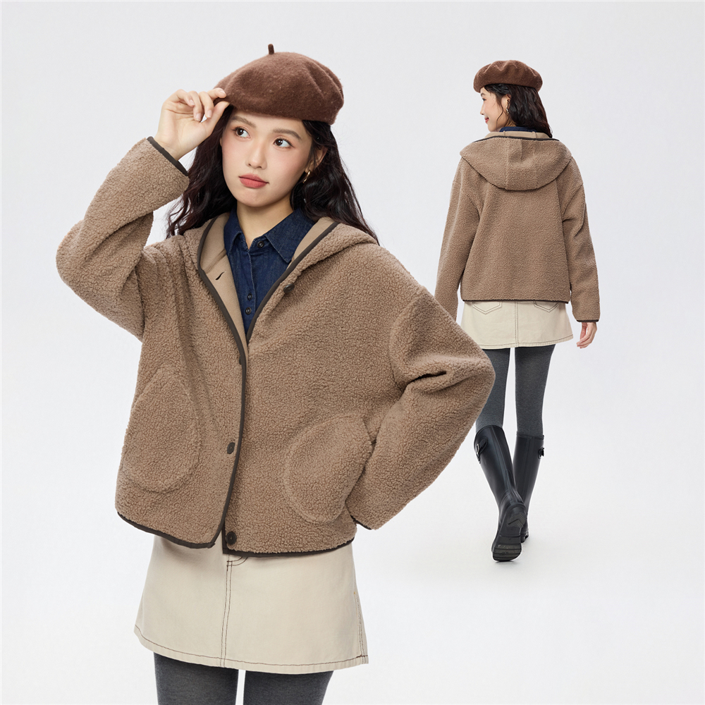 佐丹奴绒感夹克女秋冬新款 泰迪绒撞色边宽松连帽休闲外套05375870