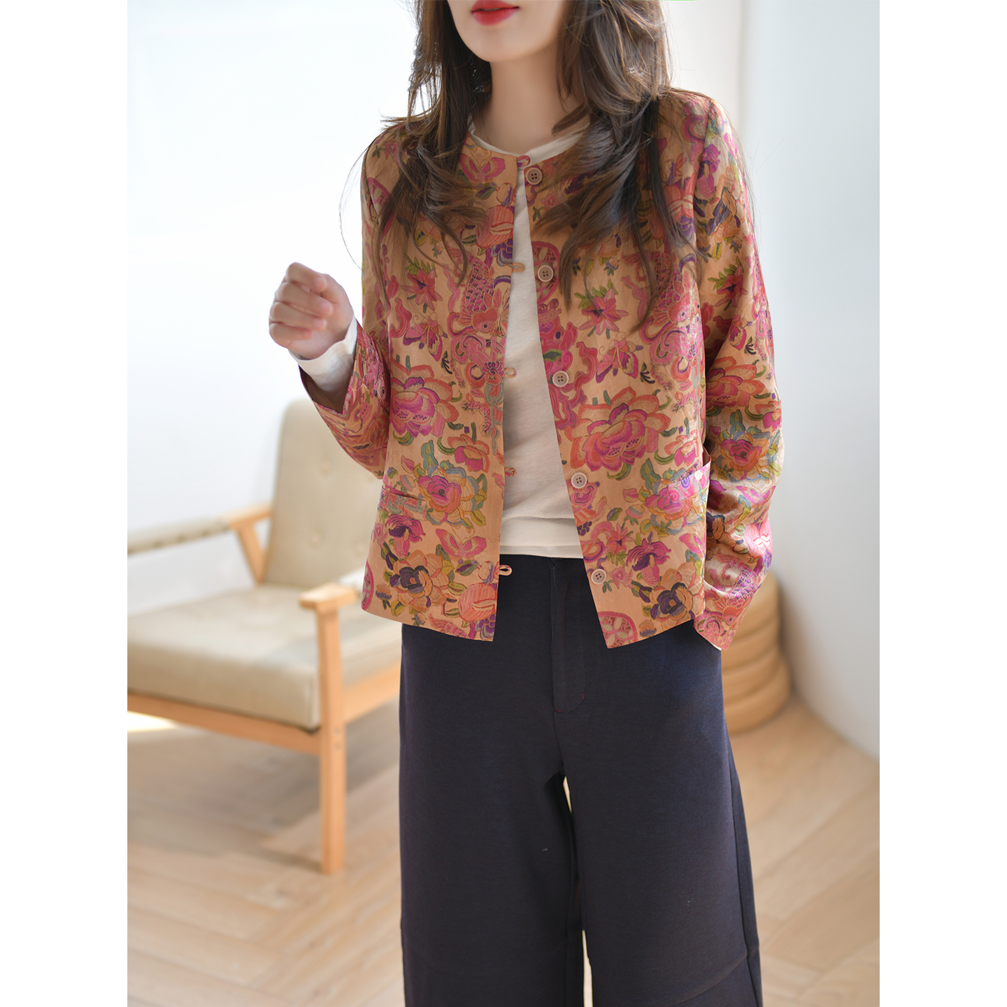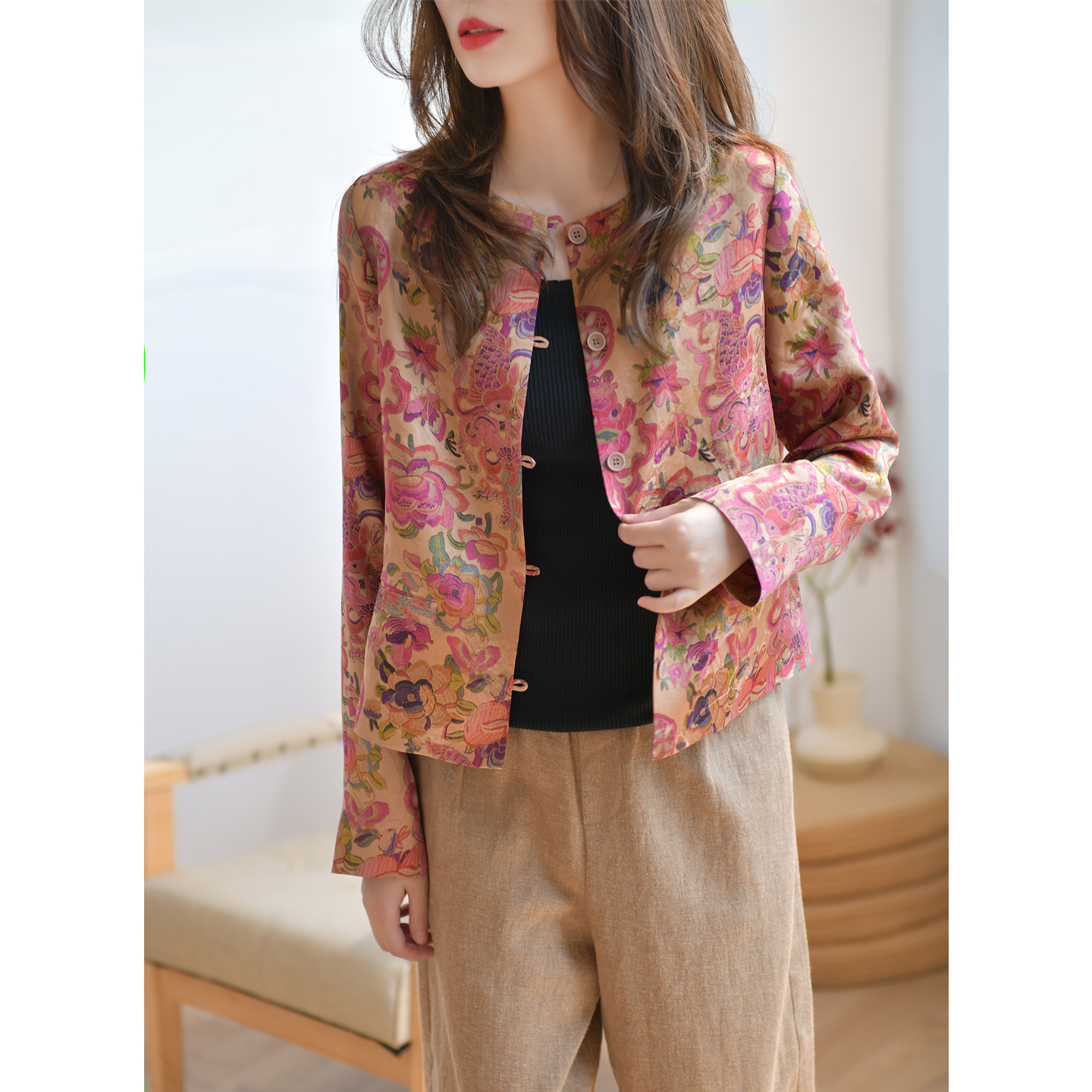 新中式 25新品 上衣显瘦 外套女秋季 GESGOO重磅真丝红云纱25姆米短款