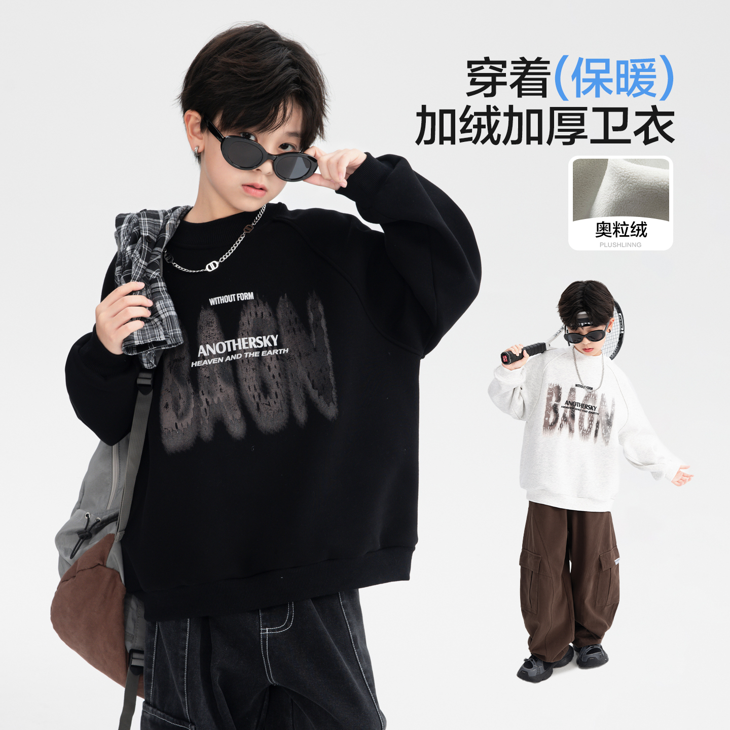 男童秋冬季 儿童男孩加厚运动上衣 黑色酷帅半高领加绒卫衣2025新款