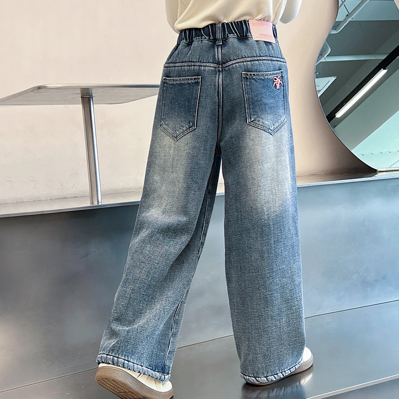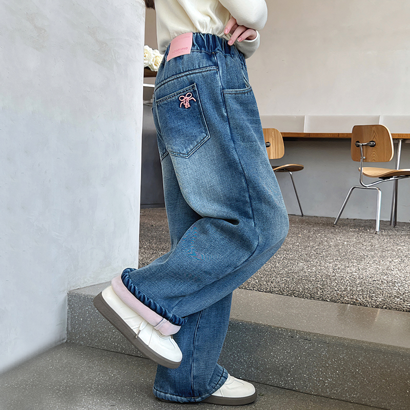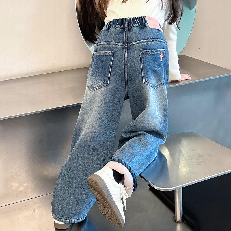 新款 2025冬装 子大儿童洋气休闲长裤 一体绒加厚女童宽松复古牛仔裤