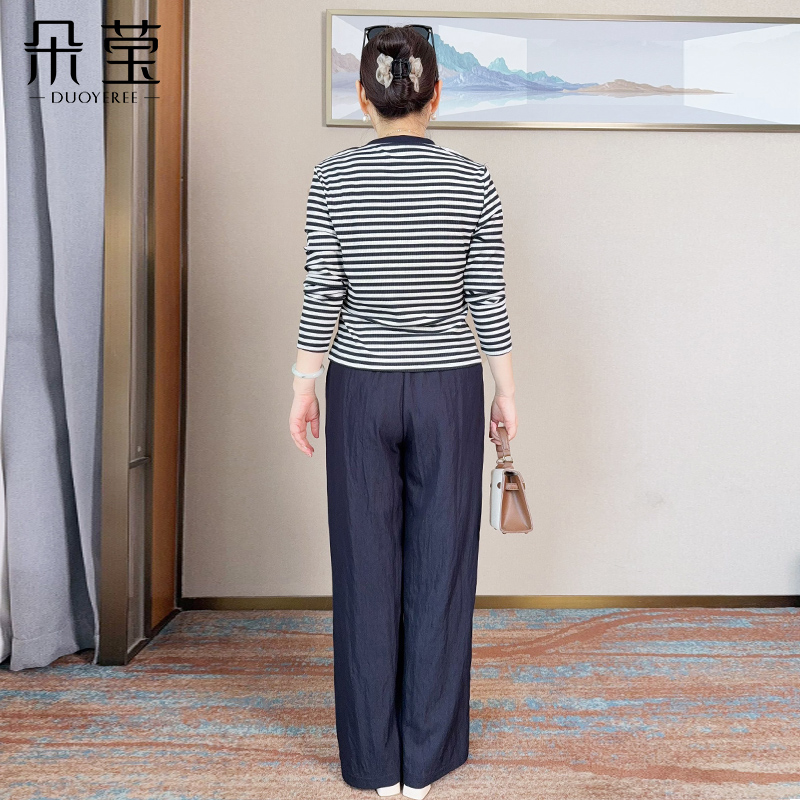 中老年女装 朵莹妈妈秋装 新款 秋季 洋气条纹T恤两件套 休闲气质套装