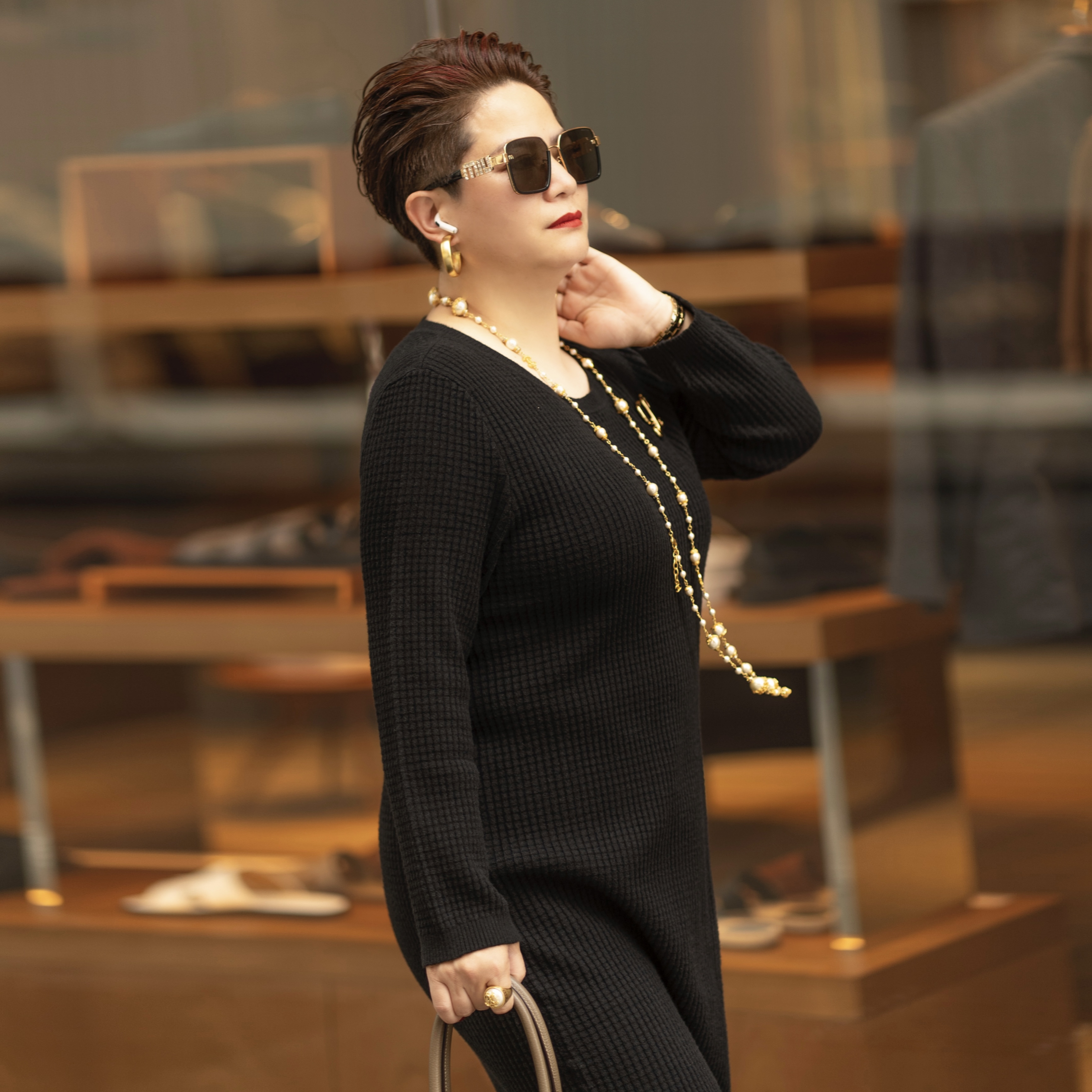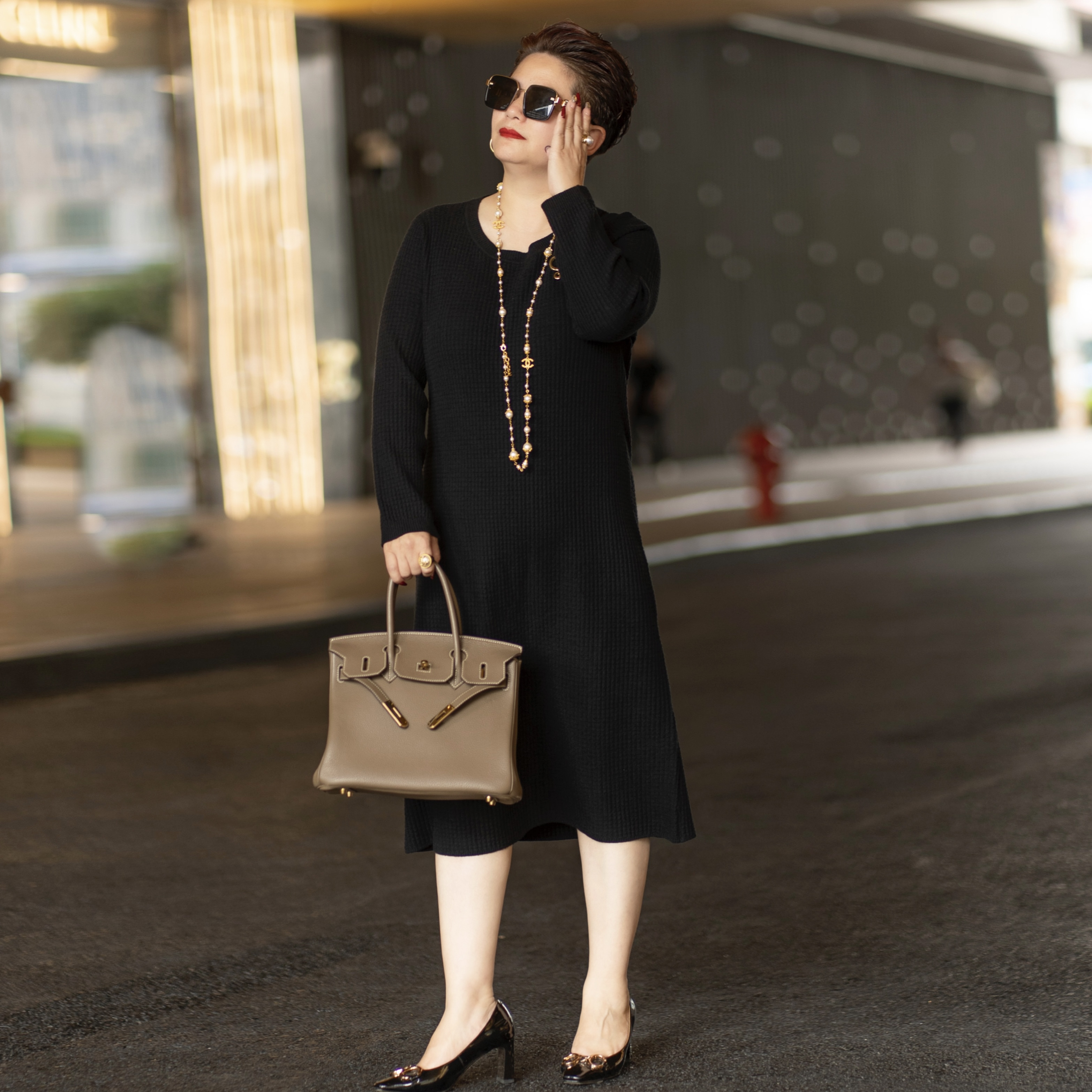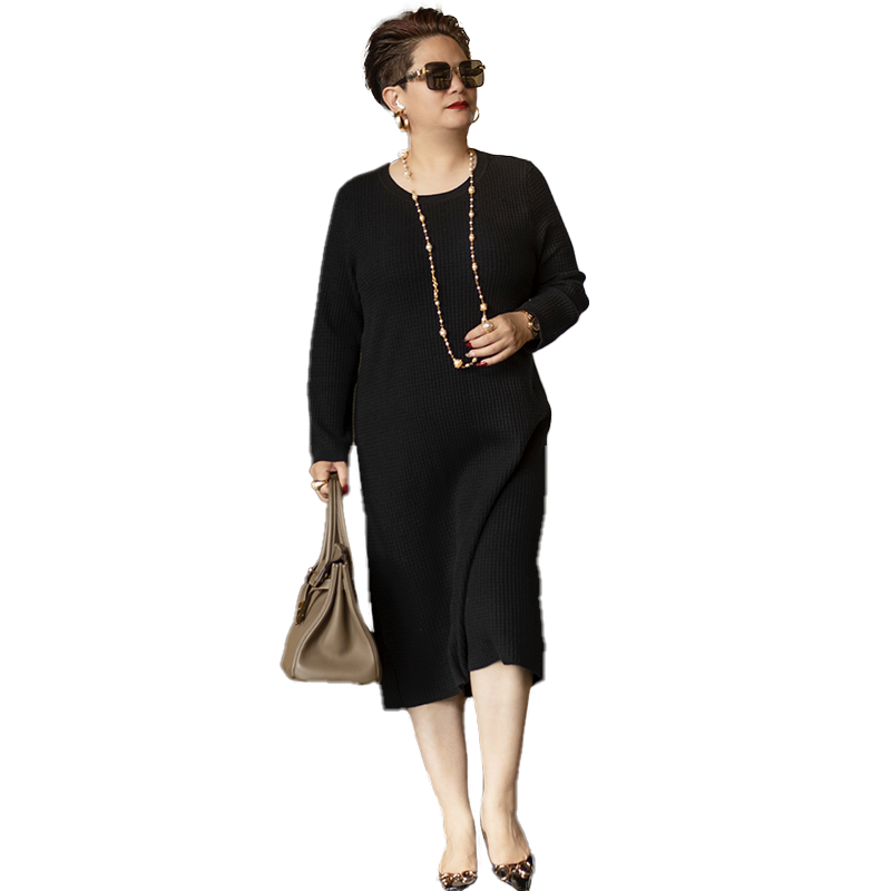 帝柔帝柔黑色连衣裙2025秋季 显瘦通勤 套头高腰休闲腰带简约大码