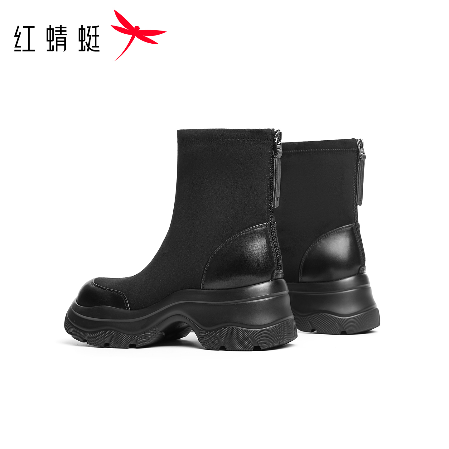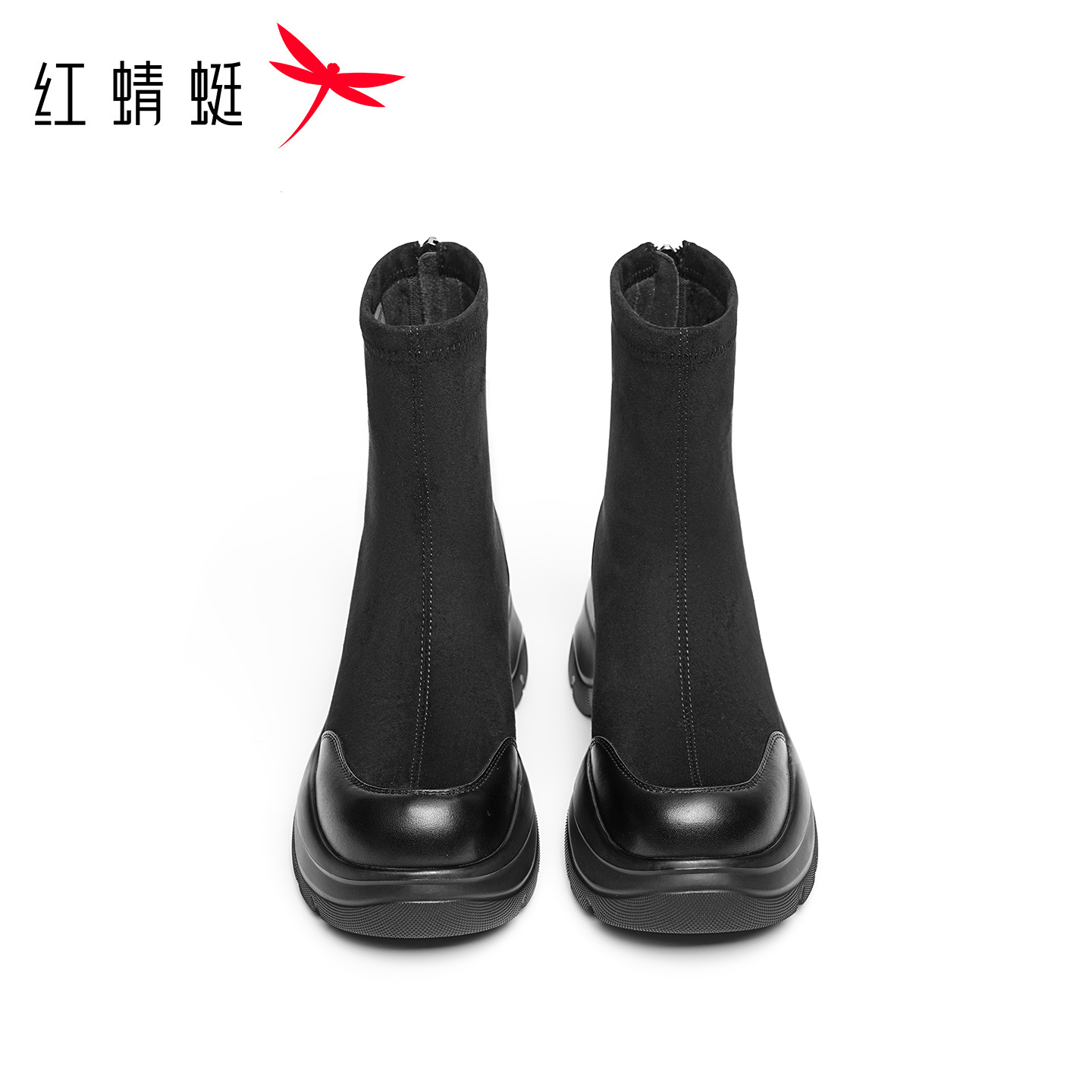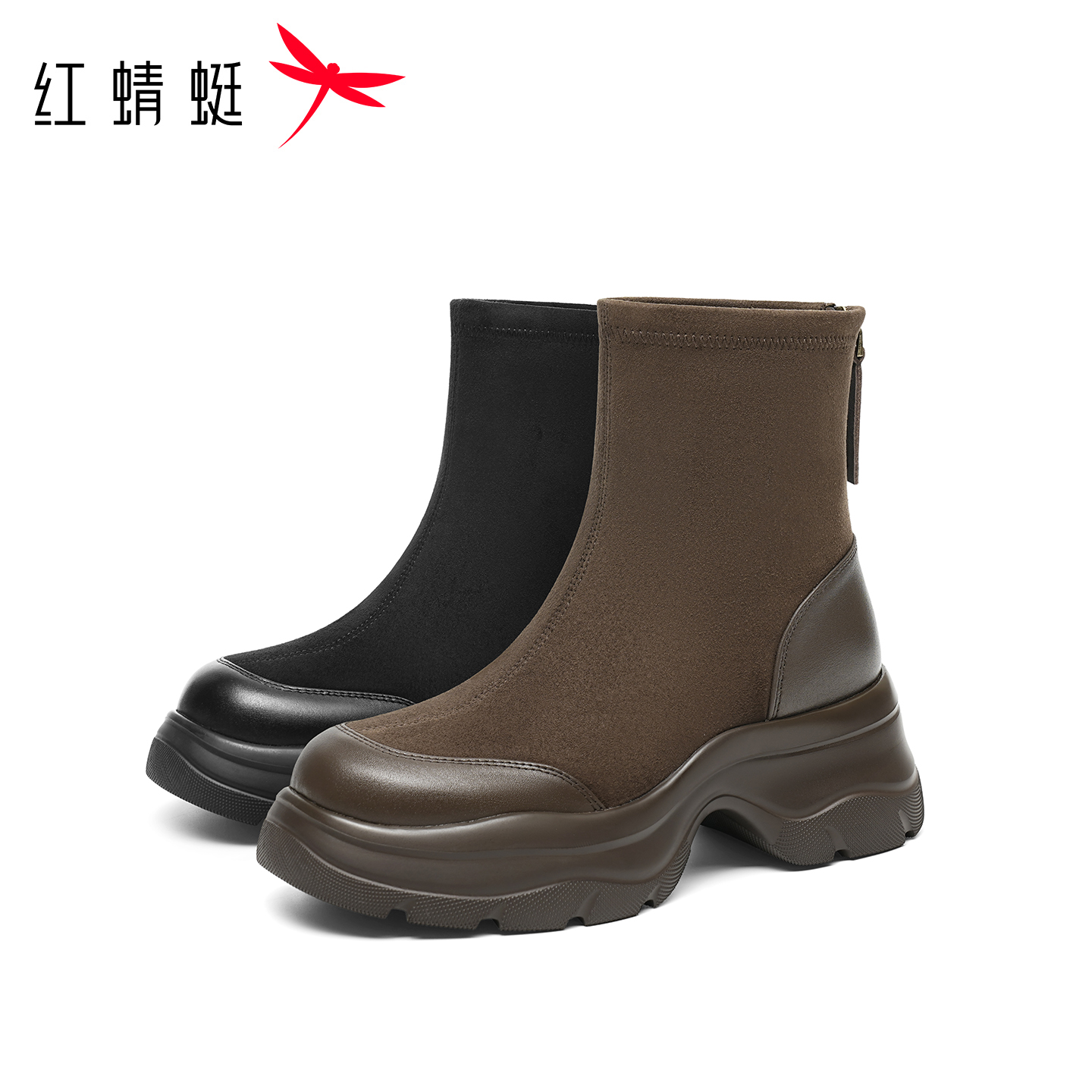 红蜻蜓弹力靴2025秋冬新款 厚底增高中筒靴黑色瘦瘦靴棕色短靴 女鞋
