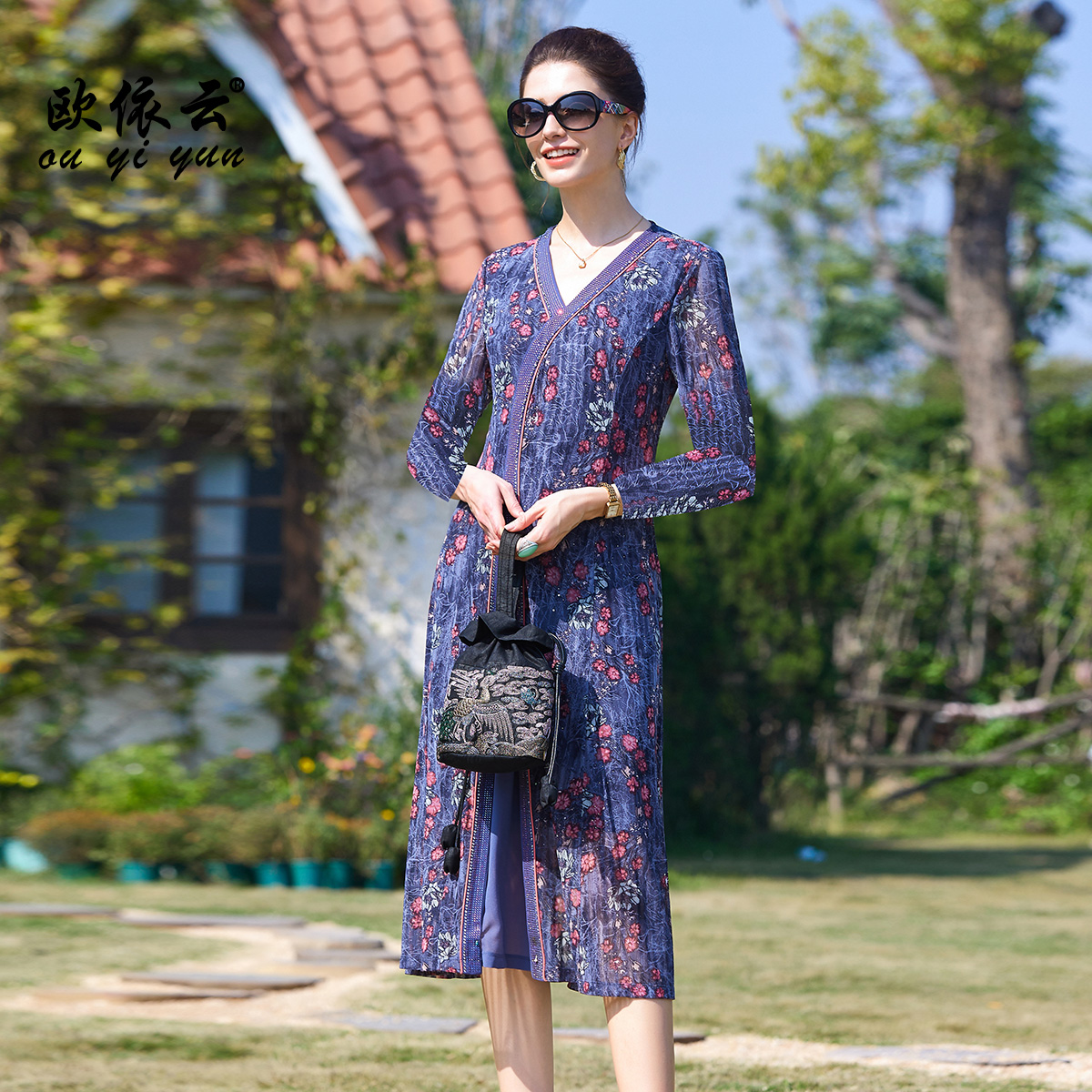 裙子 修身 欧依云中年妈妈洋气碎花连衣裙收腰显瘦2025新款 早秋薄款