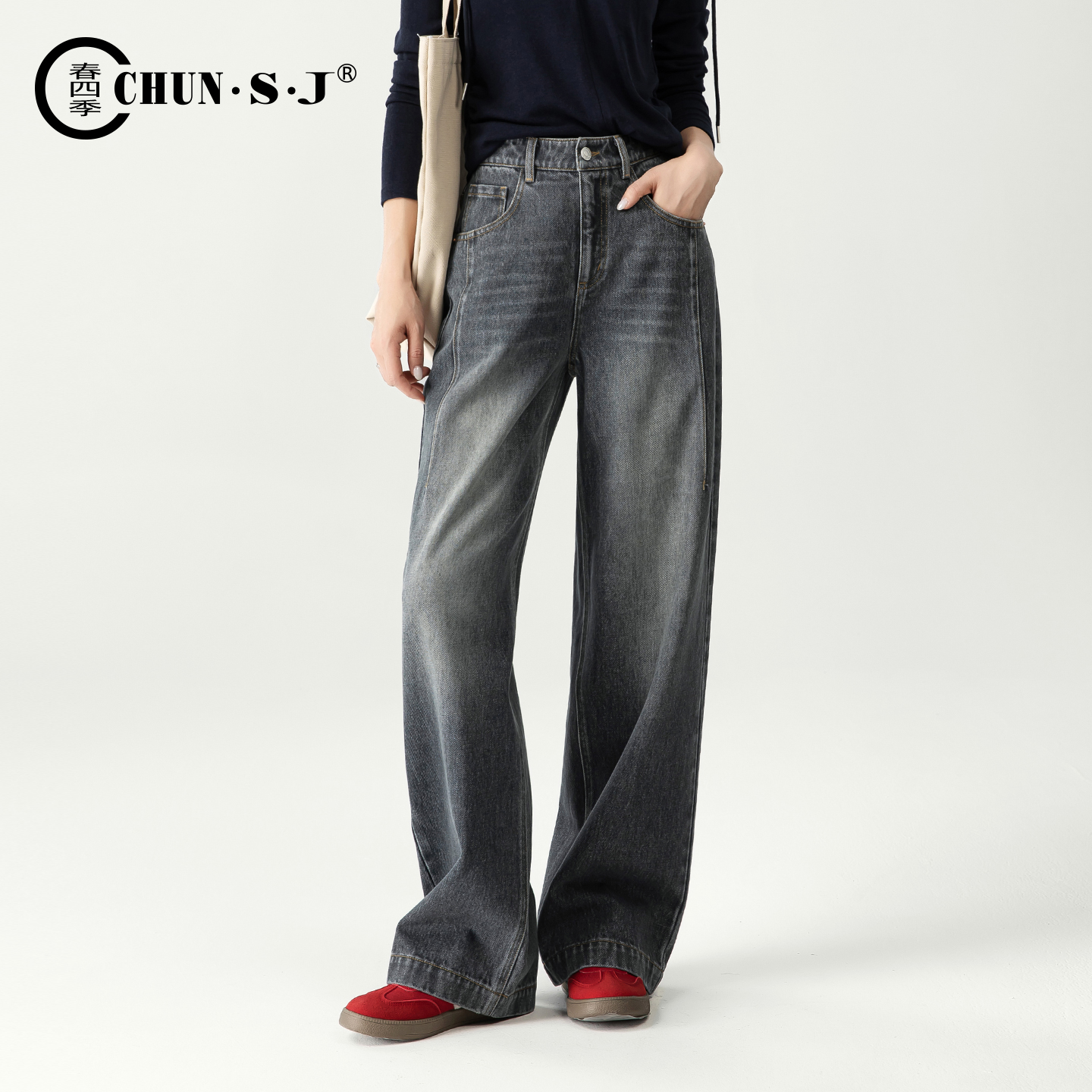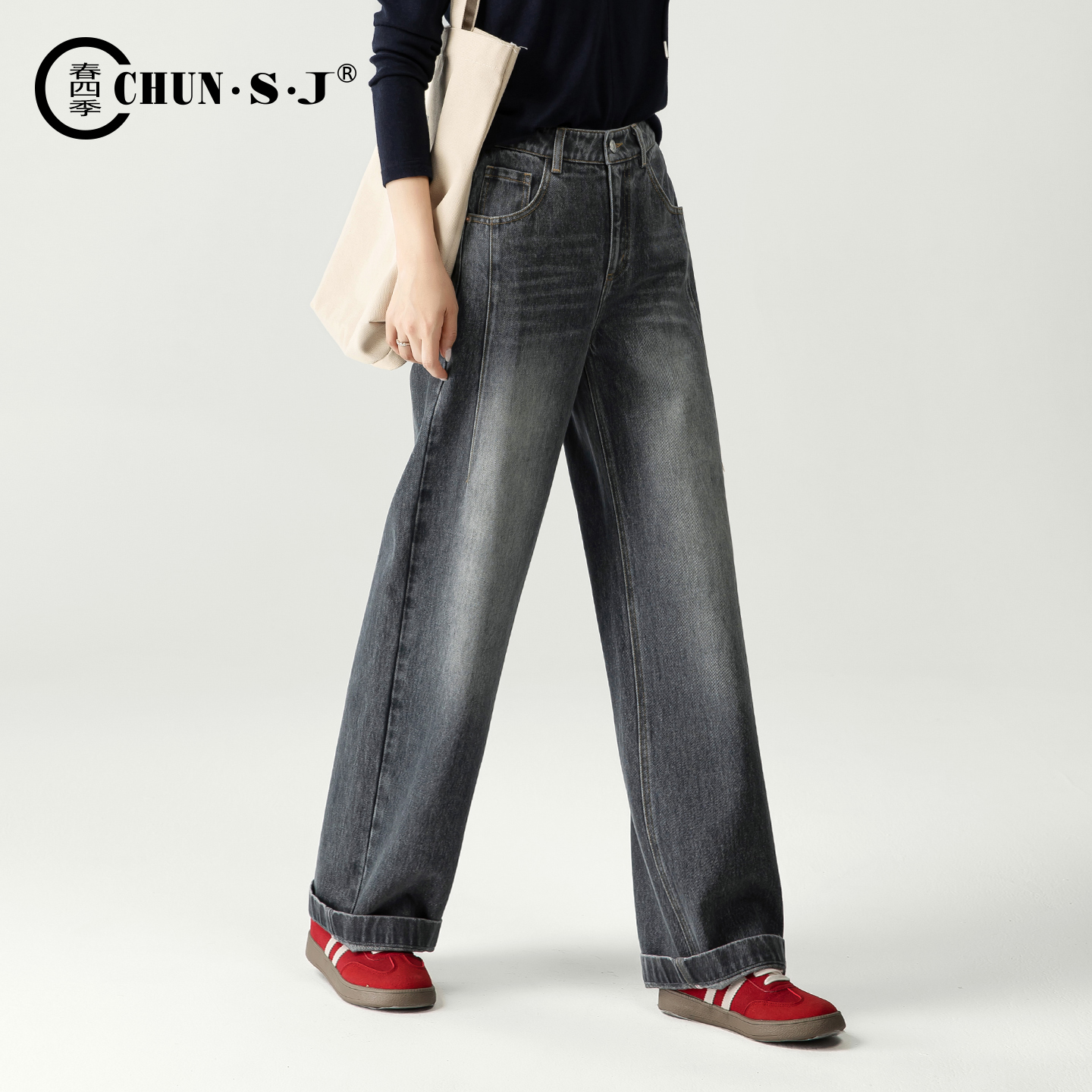 2025新款 女秋季 宽松长裤 休闲女裤 美式 高腰直筒裤 灰色阔腿牛仔裤