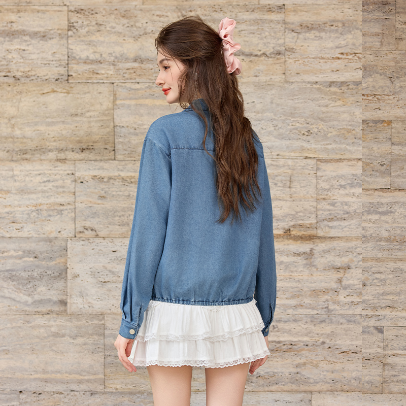 白鹿语复古甜美花朵牛仔衬衫 设计感蕾丝花边拼接小众上衣 25秋新款