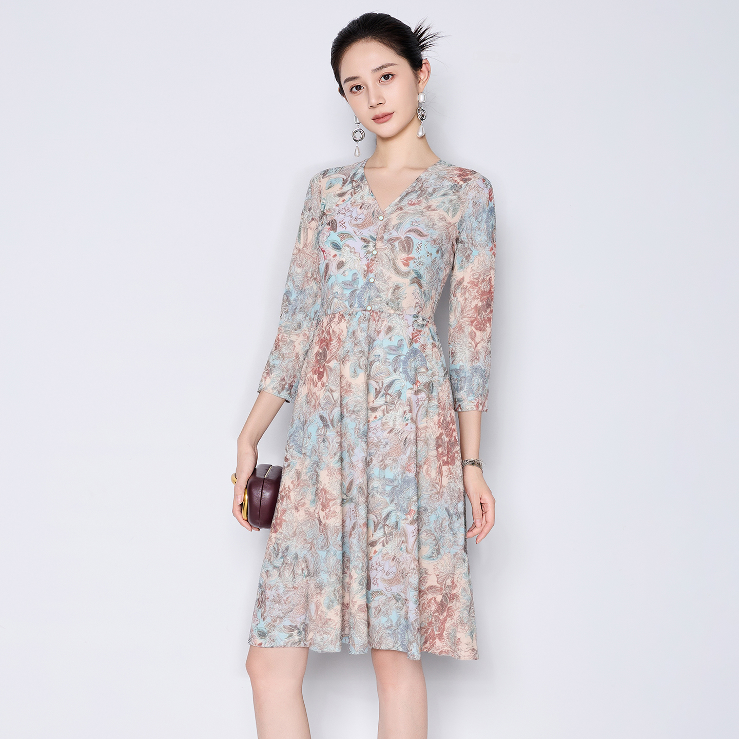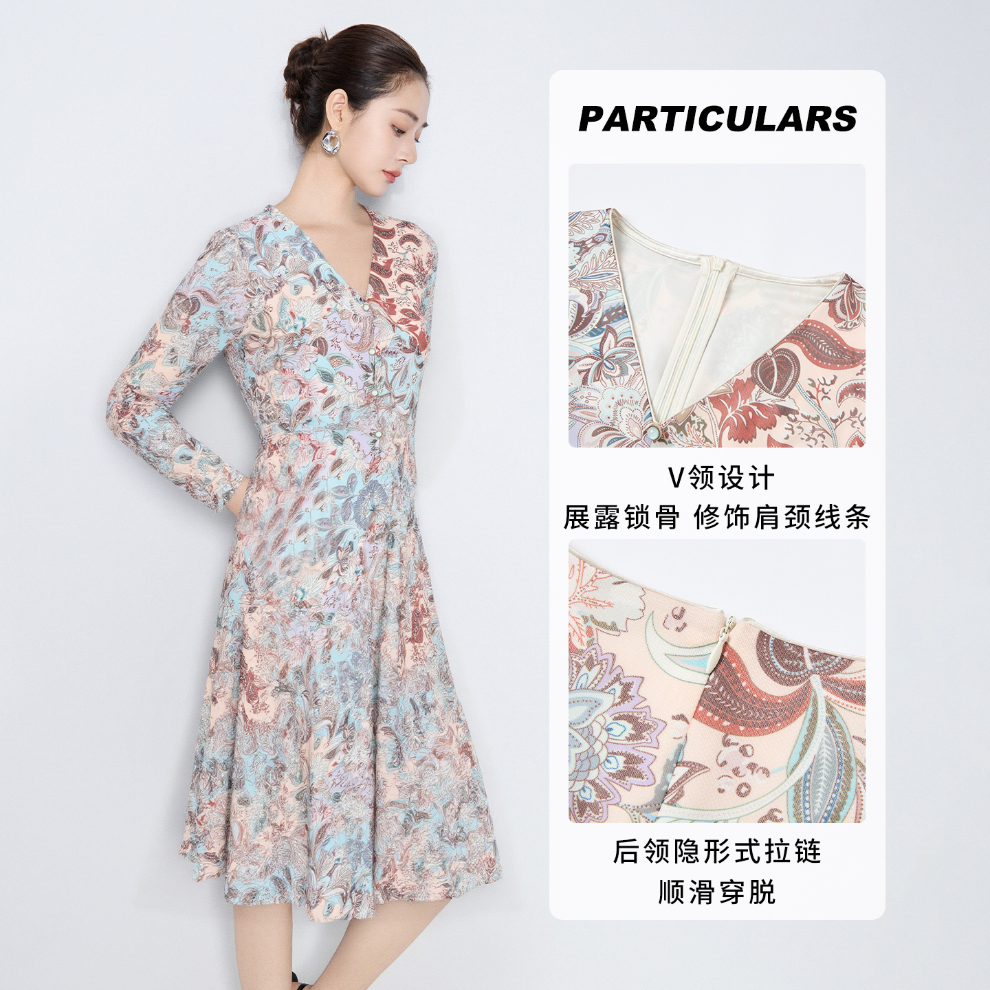 度假女 连衣裙子气质时尚 马天奴2025秋冬新款 蓝色印花V领收腰长袖